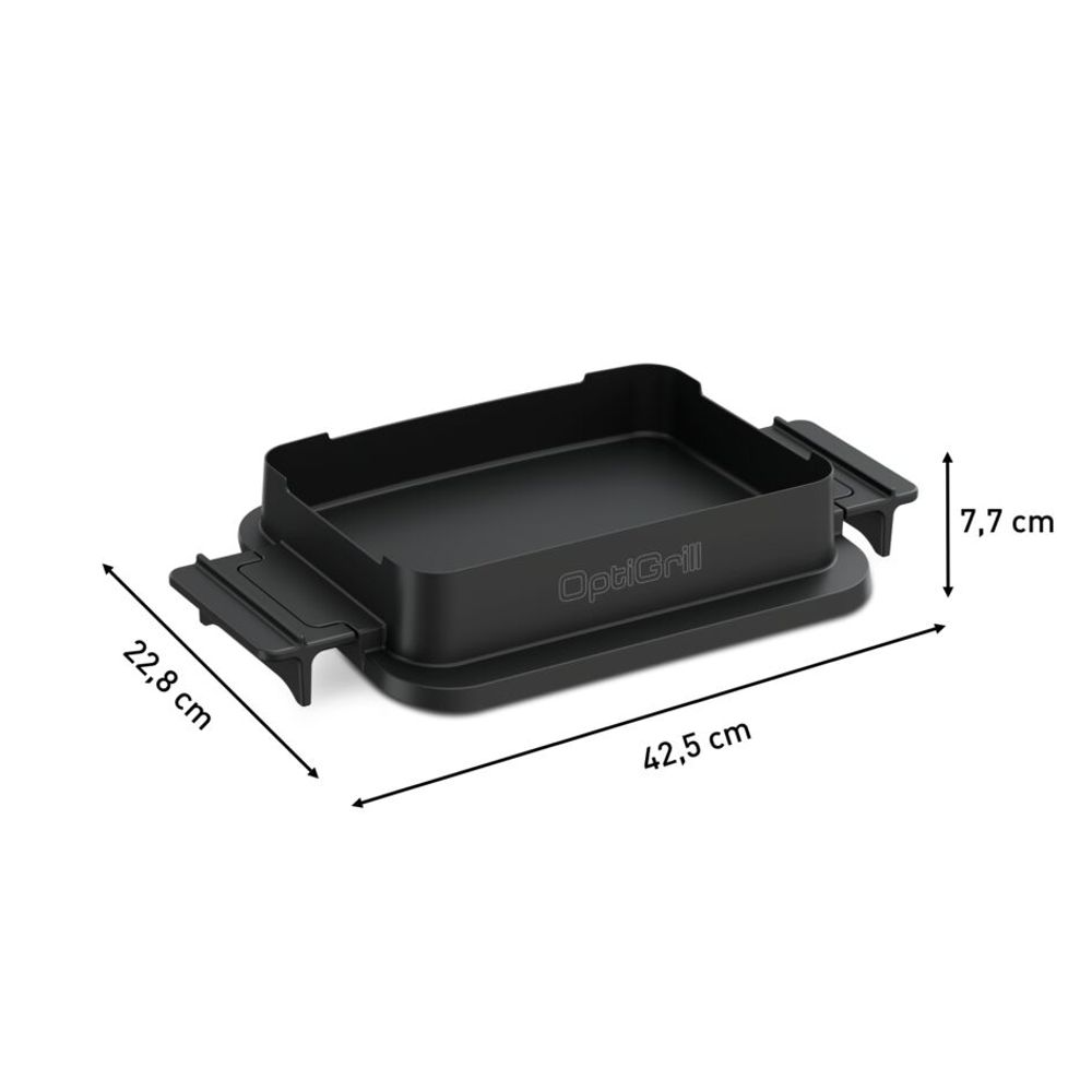 Prepara toate retetele tale preferate cu usurinta! Accesoriul este confectionat din aluminiu turnat, oferind rezultate rapide si de inalta calitate. Introdu tava in OptiGrill si utilizeaza functia manuala pentru a coace, incalzi/reincalzi sau prepara o varietate de gustari sarate sau dulci. Manerele rezistente la temperaturi ridicate permit servirea directa a preparatelor pe masa.