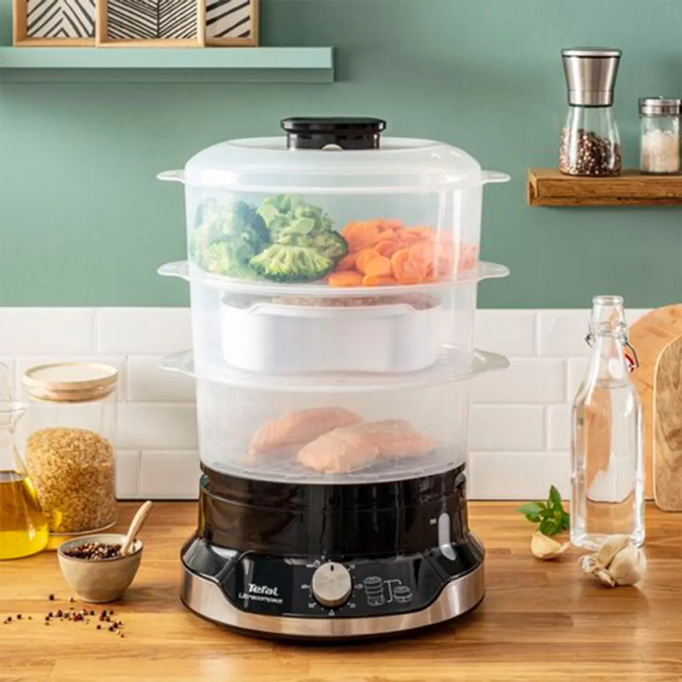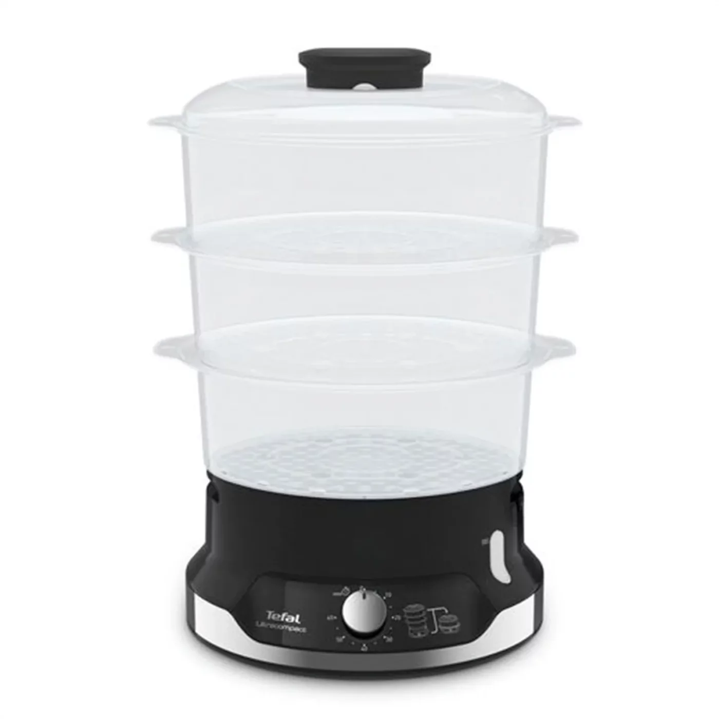 Aparatul de gatit la aburi Tefal Ultracompact VC204810 este conceput pentru a prepara mese sanatoase, rapide si gustoase, folosind metoda de gatit la aburi care pastreaza nutritia si aroma alimentelor. Cu 3 vase suprapuse si o capacitate totala de 9 L, poti gati simultan ingrediente diferite fara sa amesteci gusturile. Recipientele sunt fabricate din materiale fara BPA, pentru siguranta alimentelor.