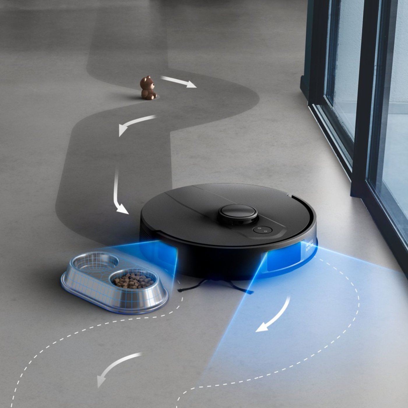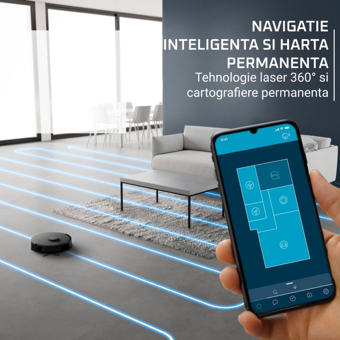 Datorita senzorilor pentru obstacole joase, aspiratorul detecteaza si ocoleste jucarii, pantofi sau boluri pentru animale, asigurand o curatenie fara intreruperi si fara necesitatea de a pregati camera inainte de curatare. Navigarea inteligenta cu laser 360° (LDS) creeaza harti precise ale locuintei, oferind acoperire completa si optimizand traseul de curatare.