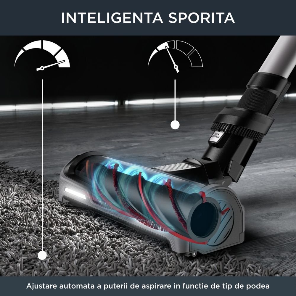 Tehnologia exclusiva Flex iti ofera o agilitate sporita, permitandu-ti sa aspiri de pana la 4 ori mai departe sub piesele joase de mobilier fara sa fie nevoie sa te apleci, in timp ce peria principala dotata cu iluminare LED Power scoate la iveala orice urma de praf. Ecranul Smart Control Display afiseaza in timp real autonomia ramasa si iti permite sa reglezi cele 5 trepte de putere disponibile. In plus, modul Auto ajusteaza inteligent puterea de aspirare in functie de tipul de suprafata intalnit. Pachetul Animal Care include peria turbo dedicata pentru indepartarea parului de animale si accesorii pentru tapiterie, transformand curatenia intr-o experienta rapida si eficienta. Cu un recipient de praf generos de 0.9L si un sistem de filtrare de 99.9%, acest aspirator asigura o igiena completa pentru casa ta.