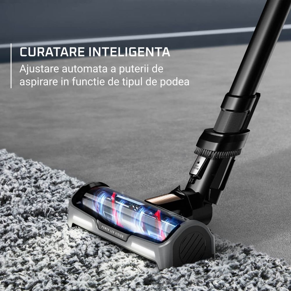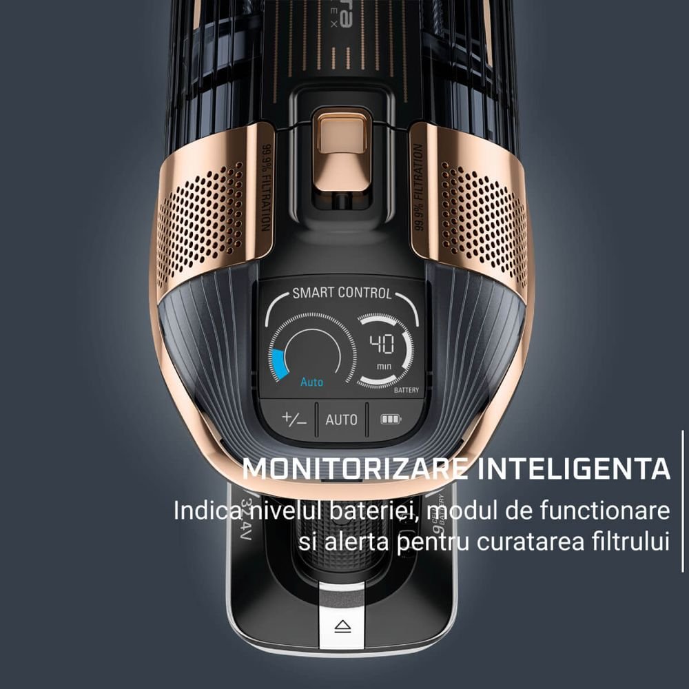 Echipat cu tehnologia Flex, aspiratorul iti permite sa ajungi de 4 ori mai departe sub mobila joasa fara sa te apleci, in timp ce sistemul de iluminare LED de pe peria principala scoate la iveala orice urma de praf. Ecranul Smart Control afiseaza in timp real autonomia ramasa (in minute sau procente) si te avertizeaza cand este necesara curatarea filtrului. Pachetul Animal Care include peria Mini Animal Turbo, perfecta pentru indepartarea parului de animale de pe canapele, textile si interiorul masinii. Cu un recipient de praf generos de 0.9L si o filtrare de 99.9%, acest aspirator asigura o igiena superioara pentru intreaga familie.