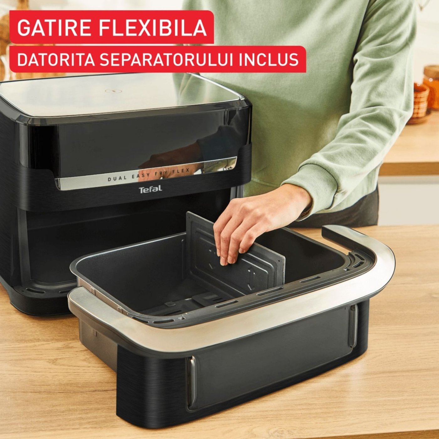 Transforma gatitul zilnic intr-o experienta rapida, sanatoasa si delicioasa cu friteuza cu aer cald Tefal Dual Easy Fry Flex.