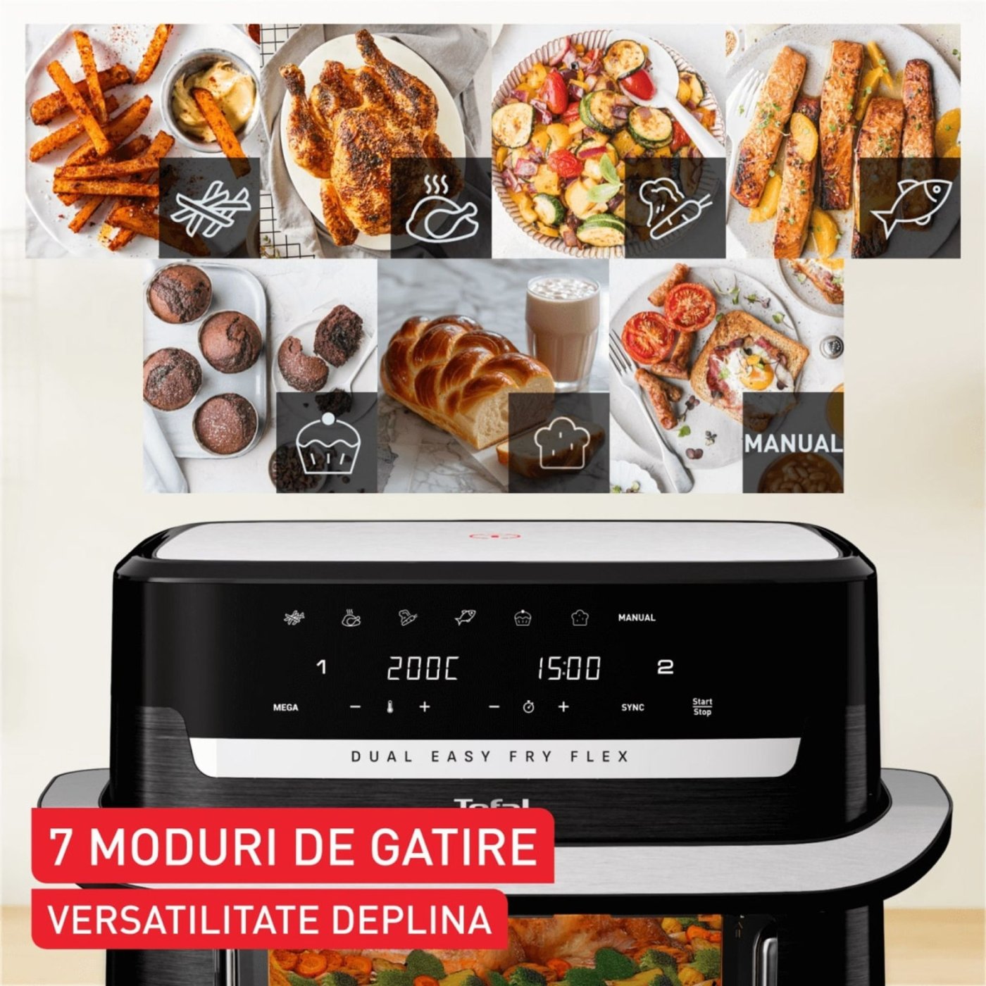 Bucura-te de 7 programe automate pentru cartofi prajiti, pui, legume, peste, desert si multe altele, sau foloseste modul manual pentru retetele tale creative. Sistemul inteligent controleaza timpul si temperatura separat pentru fiecare zona, oferindu-ti flexibilitate maxima.