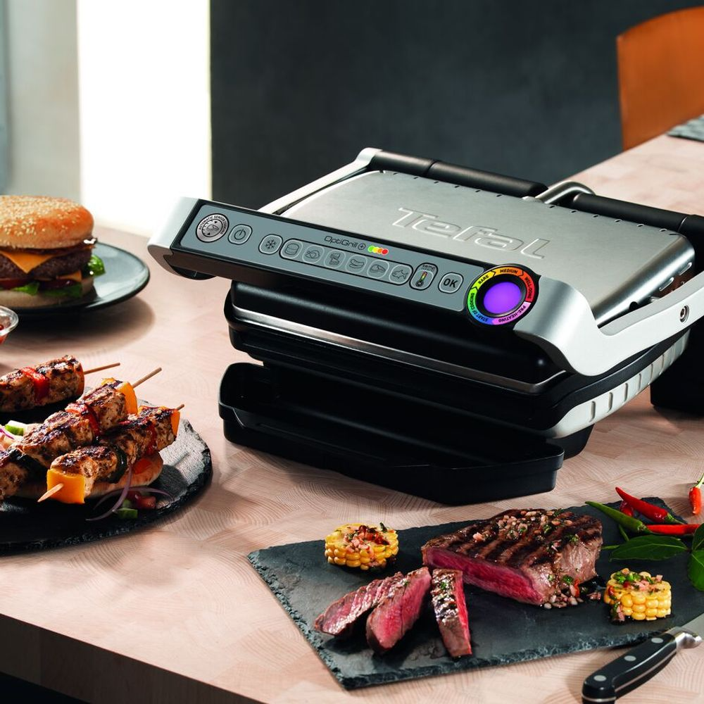 Gratarul electric Tefal OptiGrill+ GC712D34 aduce tehnologia inteligenta OptiGrill in bucataria ta pentru preparate delicioase si precise de fiecare data. Echipat cu 6 programe automate de gatit pentru burgeri, pui, sandwich, carnati, carne rosie si peste si un mod manual cu 4 niveluri de temperatura, acesta regleaza temperatura si timpul de gatire in functie de grosimea si numarul portiilor. Indicatorul luminos de gatire te informeaza vizual despre progresul preparatului, iar tavita mare pentru colectarea lichidelor si placile antiaderente din aluminiu turnat sunt compatibile cu masina de spalat vase pentru o curatare usoara. Cu o suprafata de gatire de aproximativ 600 cm² si o putere de 2000 W, acest gratar este perfect pentru mese rapide si gustoase pentru 2–4 persoane.