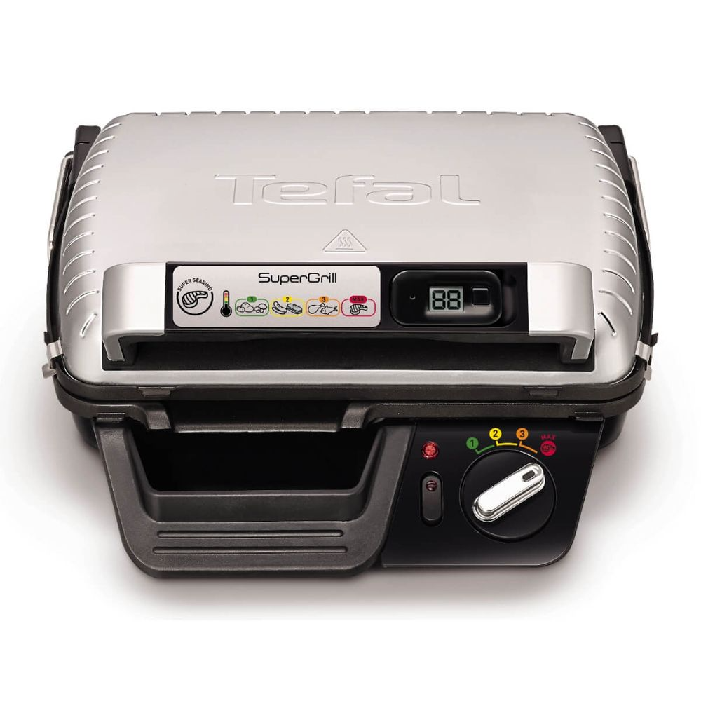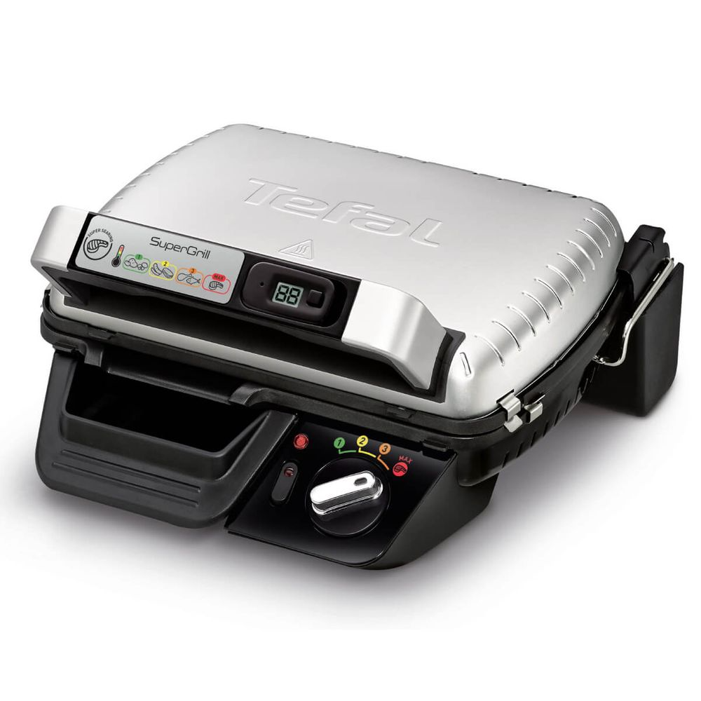 Gratarul electric Tefal SuperGrill GC451B12 este un gratar multifunctional puternic de 2000W, perfect pentru pregatirea unor preparate gustoase acasa. Datorita cronometrelor digitale poti seta precis timpul de gatire pentru fiecare tip de ingredient. Termostatul cu 3 pozitii ajustabile iti permite sa controlezi temperaturile in functie de tipul de aliment, iar plăcile detasabile cu invelis antiaderent faciliteaza curatarea. Poate fi folosit atat ca grill clasic, cat si in modul BBQ deschis la 180°, pentru o experienta de gratar variata. Placutele si tava pentru colectarea sucurilor sunt compatibile cu masina de spalat vase, ceea ce face intretinerea foarte usoara.