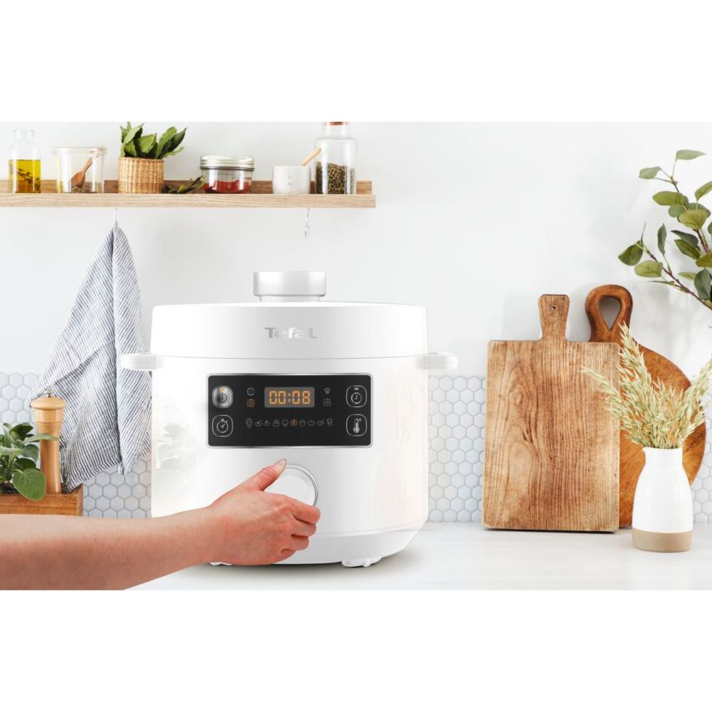 Siguranta este garantata de 12 puncte de protectie, inclusiv un sistem de eliberare automata a presiunii fara contact cu aburul fierbinte. In plus, multicooker-ul este usor de reparat timp de 15 ani, cu costuri reduse ale pieselor si peste 6200 de centre service autorizate in lume. Descopera retete delicioase si inspiratie zilnica prin aplicatia My Tefal si bucura-te de gatit simplu, rapid si sigur pentru intreaga familie.
