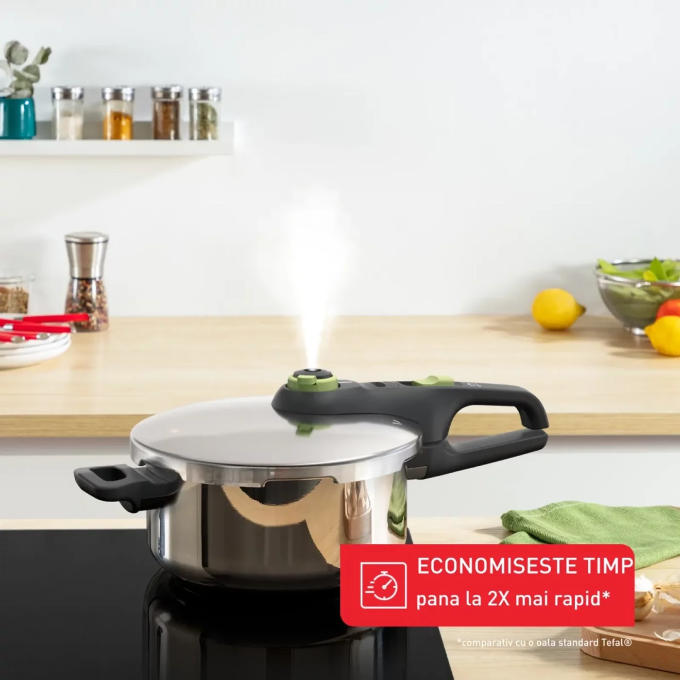 Oala sub presiune Tefal Secure Trendy P2580402, 4L, Inductie, 2 programe gatire, Sistem siguranta 5 puncte, Inox, Argintiu