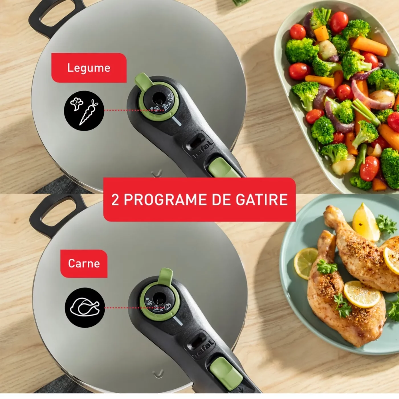 Gateste rapid si sanatos cu oala sub presiune Tefal Secure Trendy de 4 litri. Cu un design modern si 2 programe dedicate pentru carne si legume, aceasta oala din inox asigura o gatire de pana la 2 ori mai rapida. Include sistem de siguranta in 5 puncte si este compatibila cu toate plitele, inclusiv inductia.