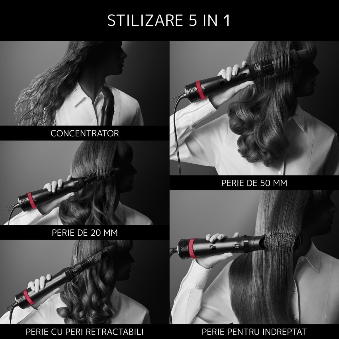 Cu 5 accesorii versatile, invelis Keratin & Glow si functia Hair Respect, aceasta perie cu aer cald ofera volum, stralucire si protectie zilnica parului tau;
