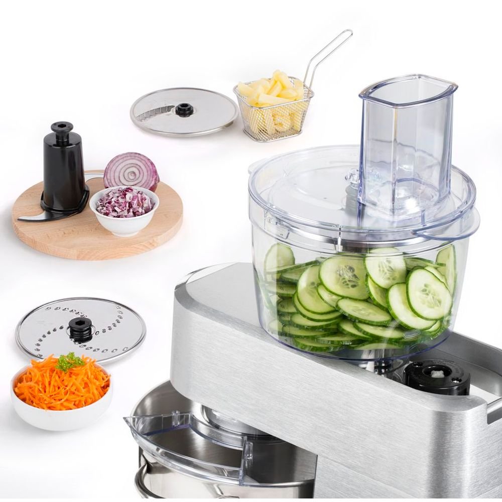 Masterchef Grande este un centru culinar complet, oferind versatilitate maxima prin accesoriile incluse: blender din sticla de 1.5L, masina de tocat carne si accesoriu pentru feliere si razuire. Tehnologia de miscare planetara dubla asigura rezultate perfect omogene, acoperind fiecare centimetru al bolului. Cu un design premium din inox si finisaje de inalta calitate, acest robot este partenerul ideal pentru cei care vor sa isi depaseasca limitele in arta gatitului si a patiseriei.