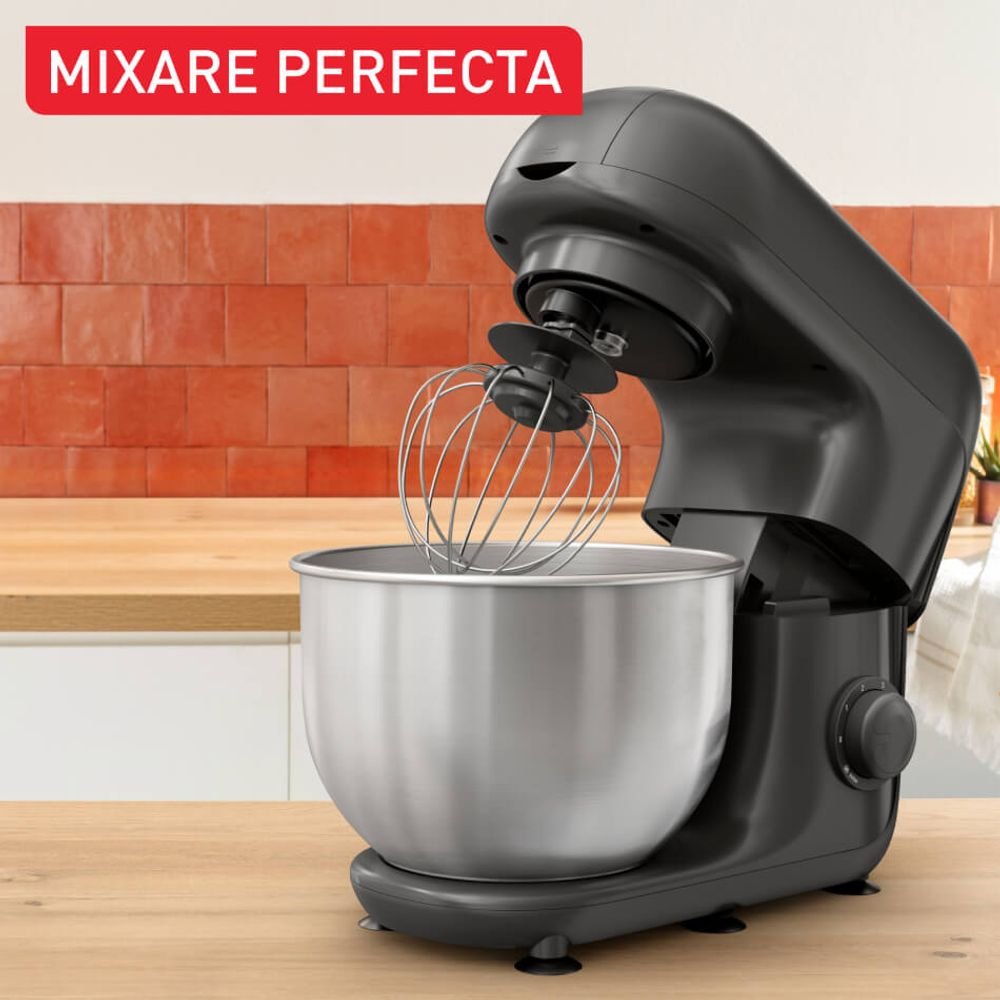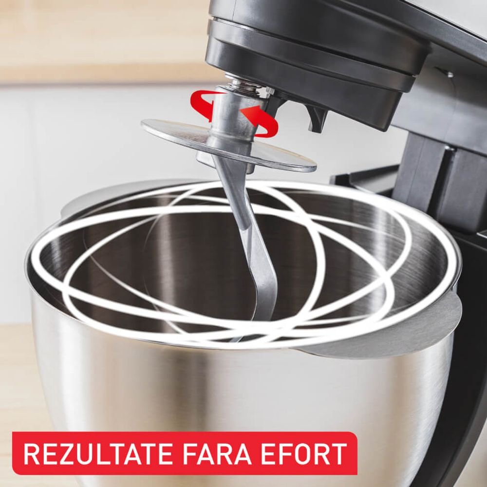 Miscarea planetara asigura o amestecare perfecta si omogena, acoperind intreaga suprafata a bolului pentru rezultate fara cusur. Robotul dispune de 6 trepte de viteza si functie Pulse, oferindu-ti control total indiferent de complexitatea retetei. Designul sau robust, de culoare neagra, se integreaza elegant in orice bucatarie, oferind performanta si durabilitate intr-un format compact. Este solutia ideala pentru cei care cauta eficienta si simplitate in patiserie.