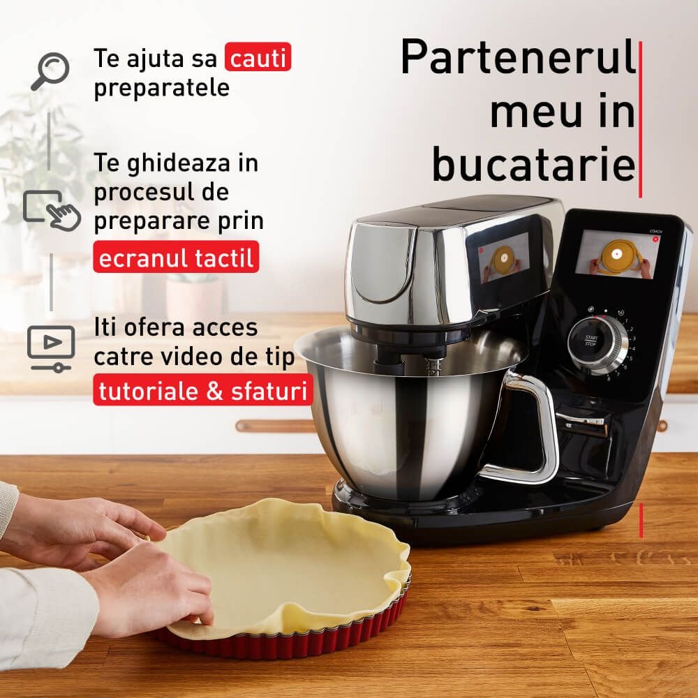Pachetul include un cantar digital conectat pentru precizie maxima si un kit de patiserie profesional (tel Flex Whisk, paleta si carlig), toate intr-un design modern si ultra-silentios. Este cel mai avansat robot de bucatarie de la Tefal, conceput sa te ajute sa treci de la nivelul de incepator la cel de expert in cofetarie, oferind validare la fiecare pas si actualizari lunare ale bazei de date de retete.