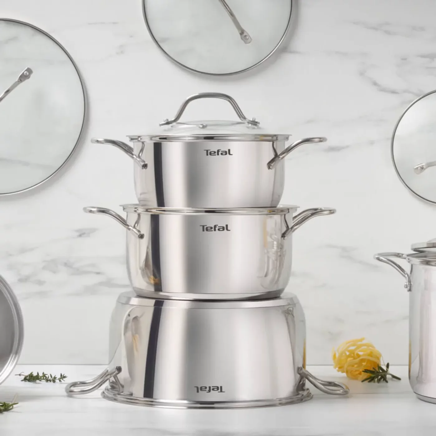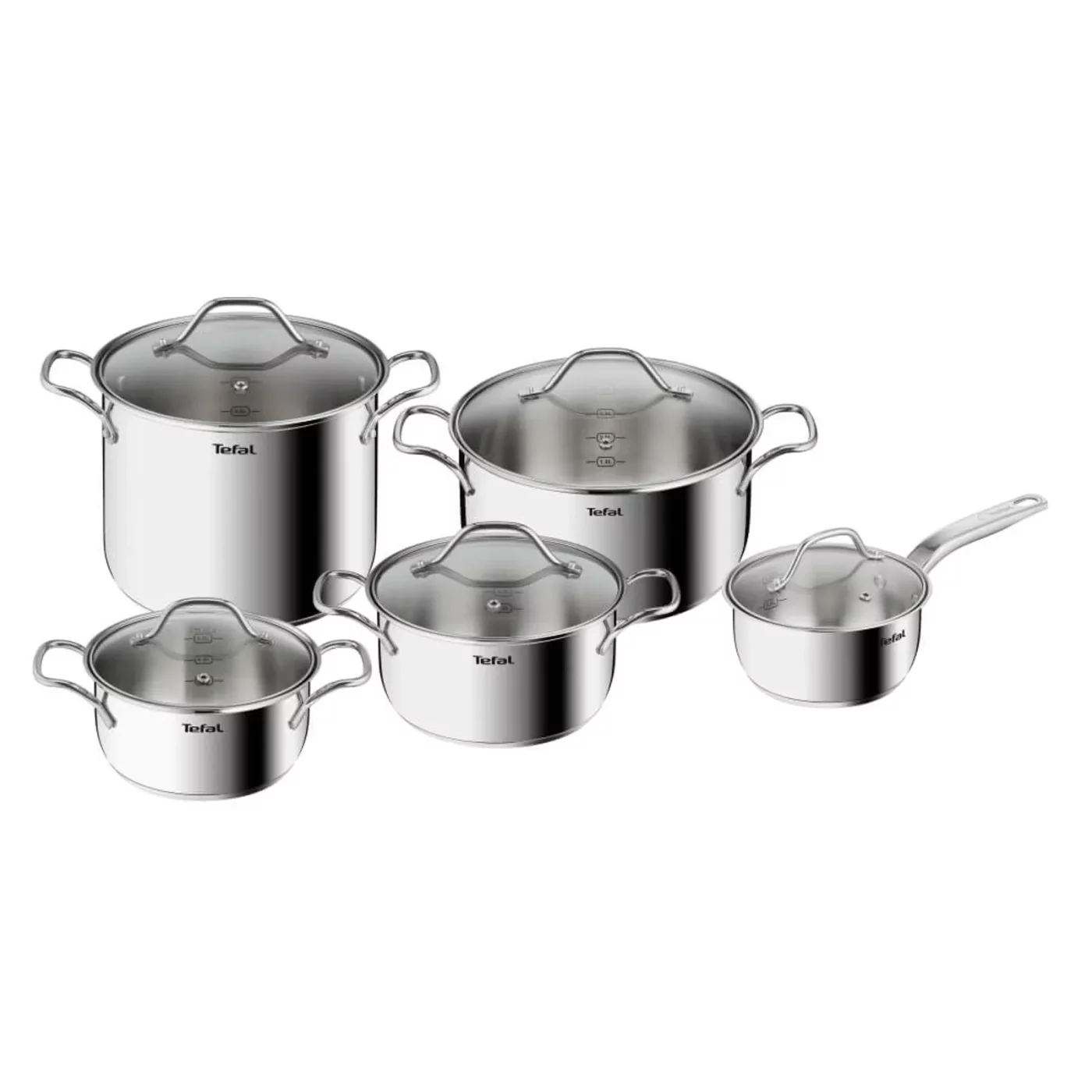 Alege setul Tefal Intuition B864SA74 din 10 piese! Include cratite si oale din otel inoxidabil premium (16/18/20/22/24 cm) cu gradatii interioare si 5 capace din sticla. Compatibile cu inductia, cuptorul (pana la 250°C) si masina de spalat vase. Baza groasa pentru gatire uniforma.