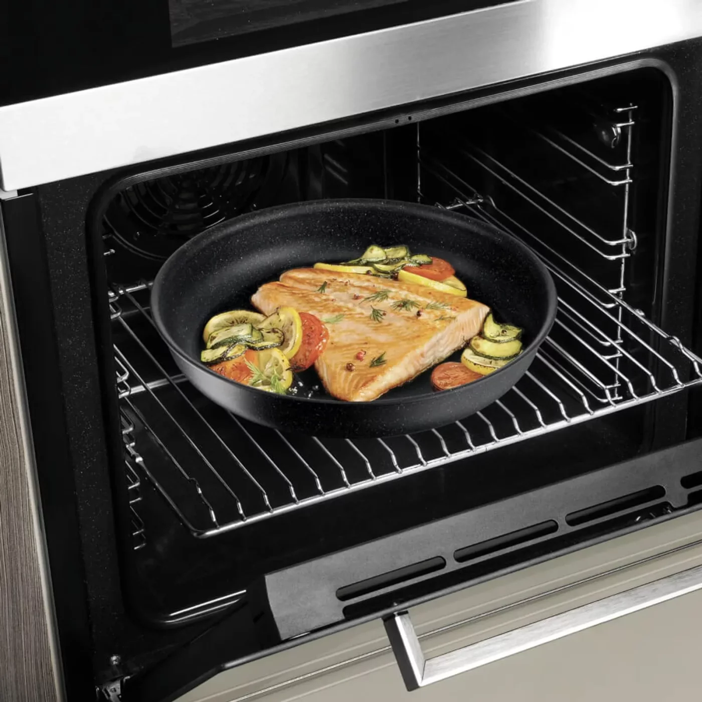 Vasele sunt prevazute cu invelis antiaderent Mineralia+, consolidat cu minerale pentru performante excelente si curatare usoara, chiar si dupa sesiuni intense de gatit. Baza Thermo-Fusion™ asigura incalzire rapida si distributie uniforma a caldurii, iar Thermo-Signal™ indica momentul optim pentru gatit, pentru preparate crocante la exterior si fragede la interior.