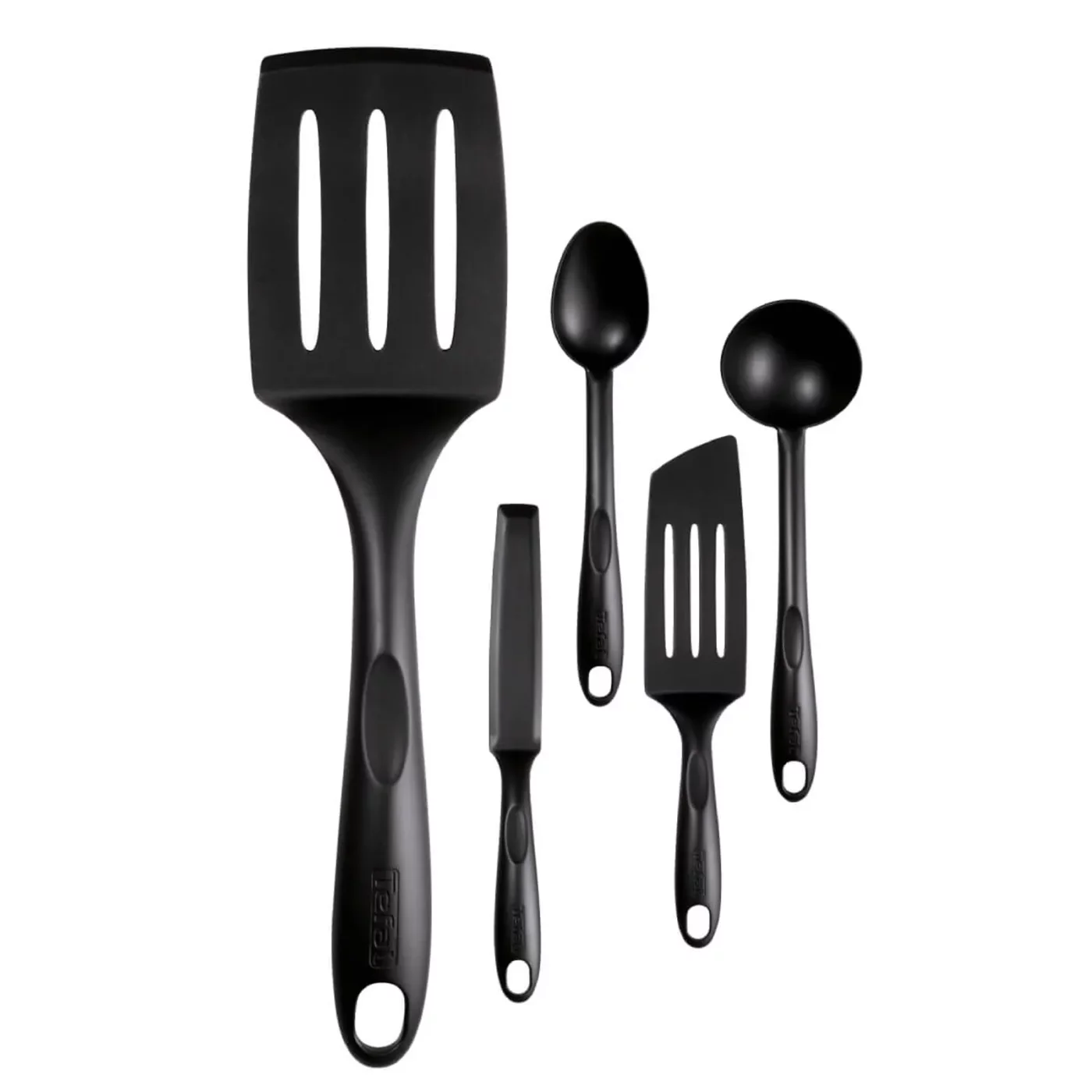 Set de 5 piese Tefal Bienvenue K001A504, Nylon cu 15% fibra de sticla, Rezistenta 220 grade, Sigur pentru antiaderent, Negru