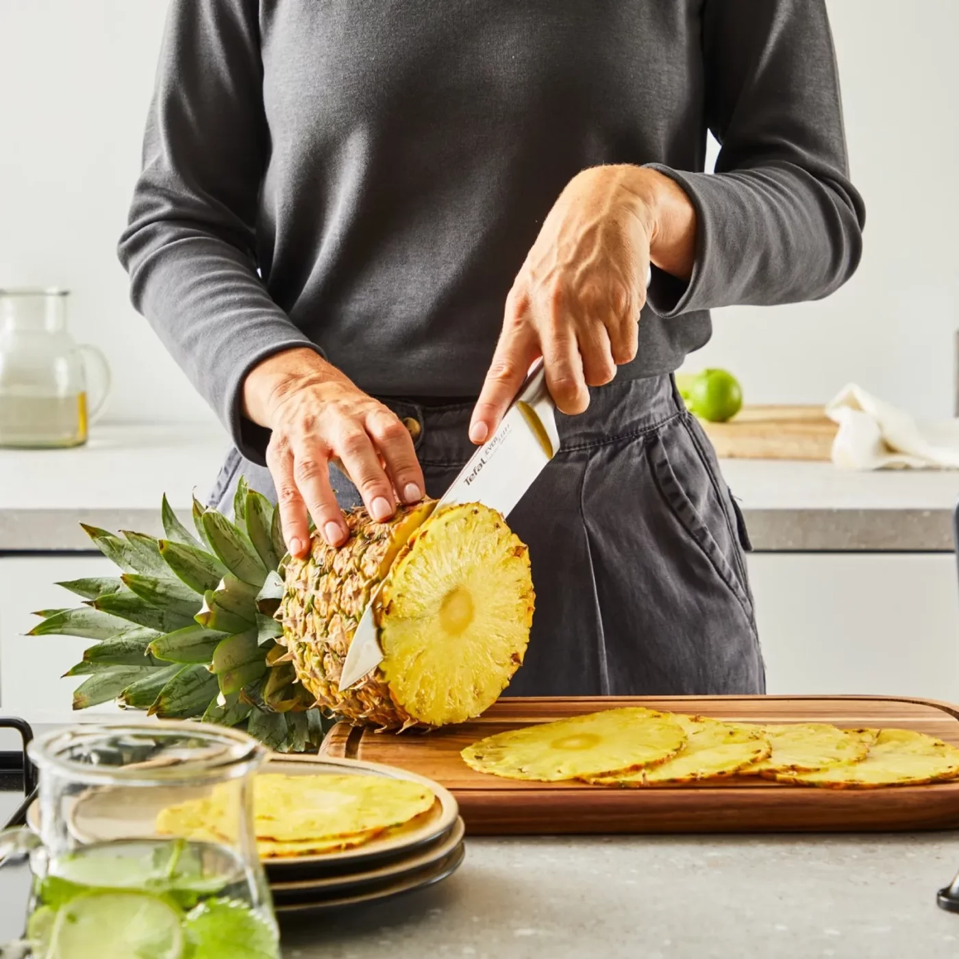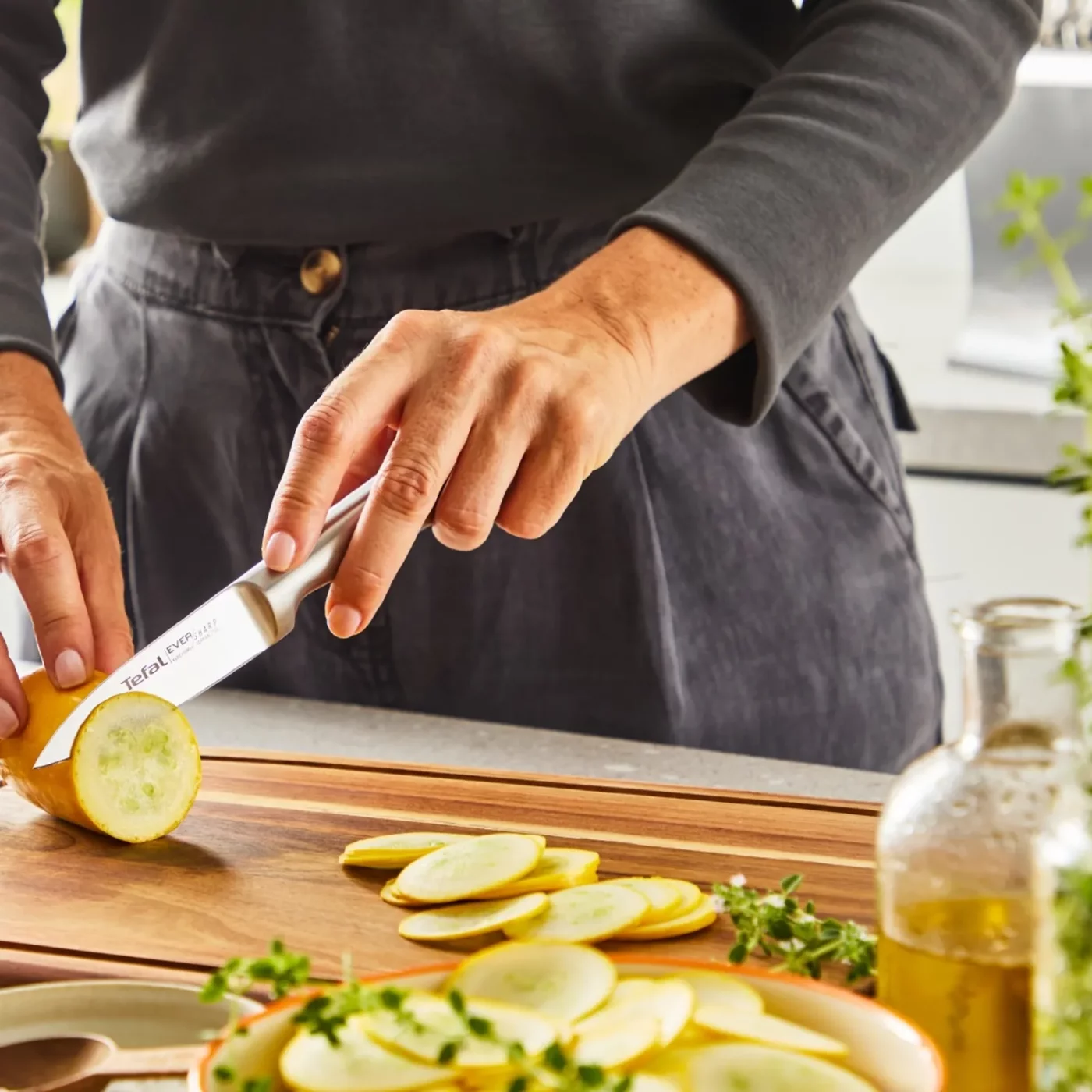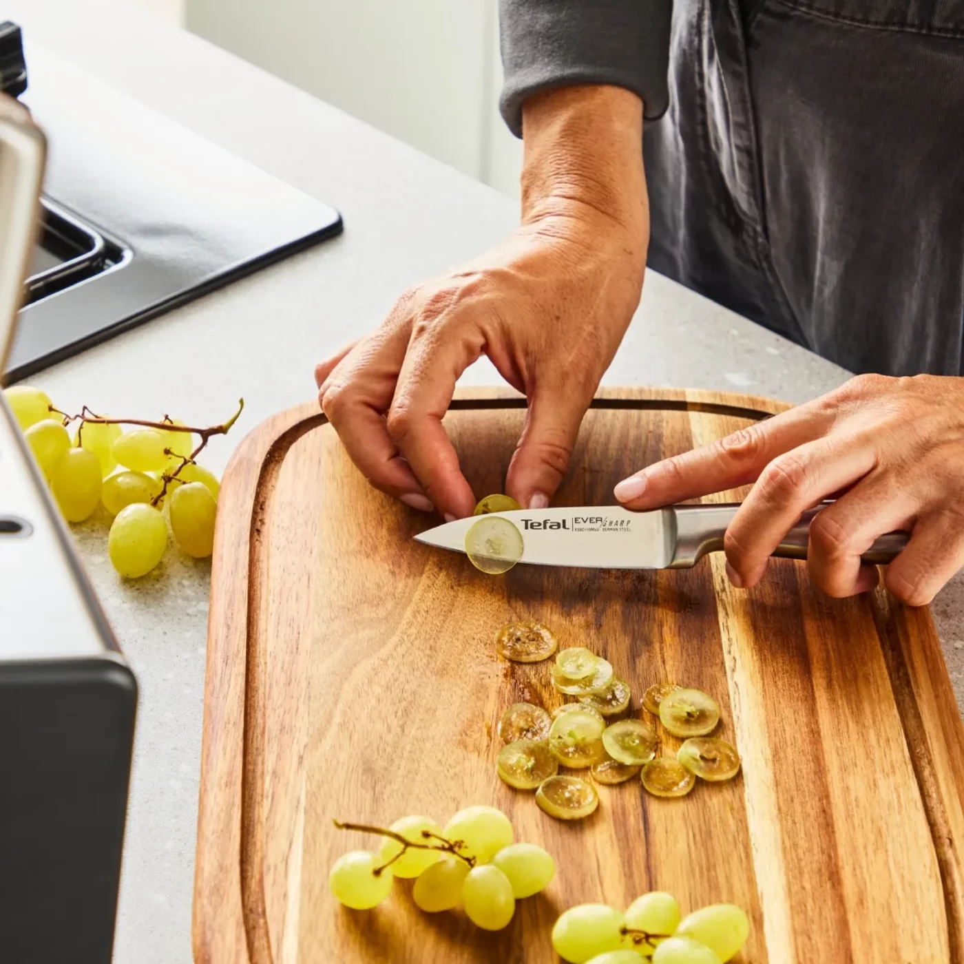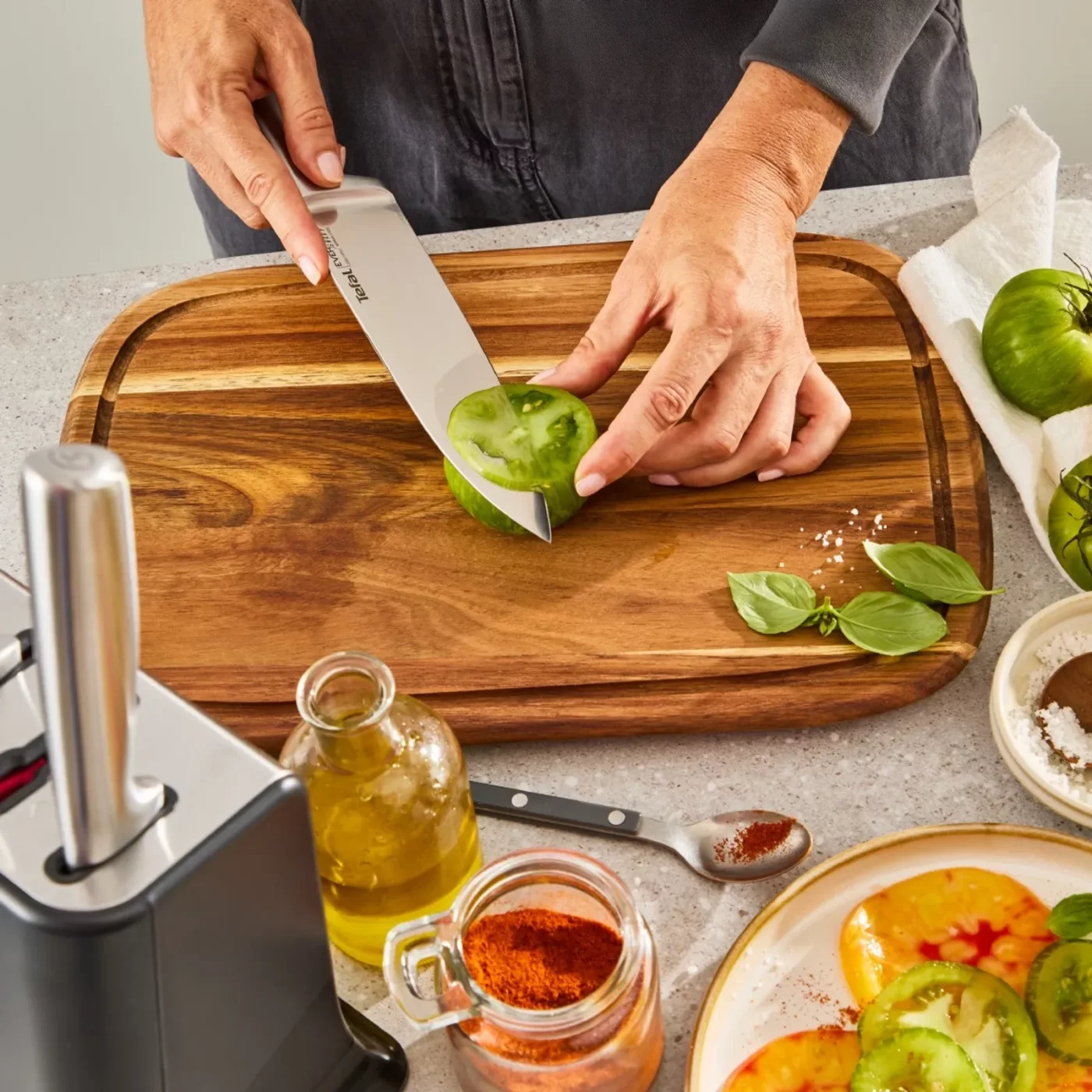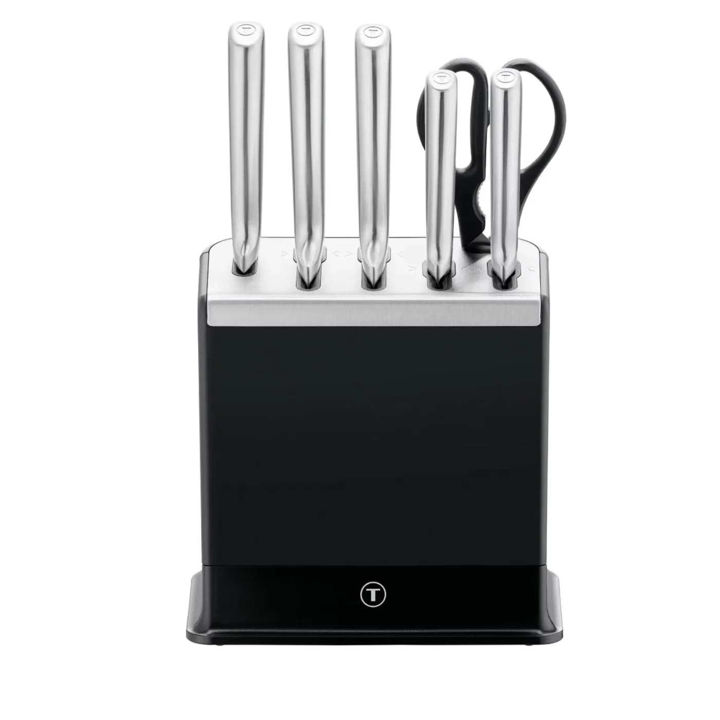Setul de cutite Tefal Eversharp Pro K2977S44 include 5 cutite esentiale si un suport inovator cu sistem de ascutire integrat. Tehnologia patentata ascute automat lamele din inox german inainte si dupa fiecare utilizare, garantand o taiere impecabila zi de zi. Cutitele dispun de manere ergonomice si protectie pentru degete, fiind ideale pentru orice sarcina in bucatarie, de la feliat fructe la tocat carne.