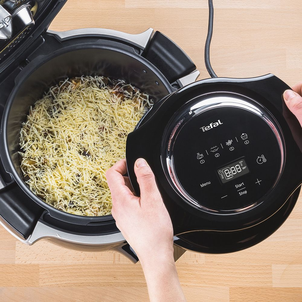 Accesoriul Tefal Extra Crisp Lid EY150830 transforma multicookerul tau Cook4Me intr-un aparat de gatire cu aer cald si friteuza sanatoasa, oferind 4 programe automate care includ rotisare, gratar, prajire si coacere pentru preparate crocante si gustoase fara ulei sau cu foarte putin ulei. Tehnologia Extra Crisp asigura gatirea rapida si eficienta — cu pana la 30% mai rapid decat un cuptor clasic, fara a fi nevoie de preincalzire — si iti permite sa pregatesti retete variate pentru intreaga familie. Designul cu ecran LED intuitiv si temperatura ajustabila de la 70°C la 200°C face controlul simplu si precis, iar timpul de gatire poate fi setat pe timer pana la 60 de minute, cu functie de oprire automata si semnal sonor la final. Accesoriul se conecteaza usor la multicooker si extinde functionalitatea aparatului, oferind posibilitatea de a prepara preparate crocante, rumenite si coapte direct in aparatul tau Cook4Me, fara sa fie nevoie de alte echipamente de gatit.