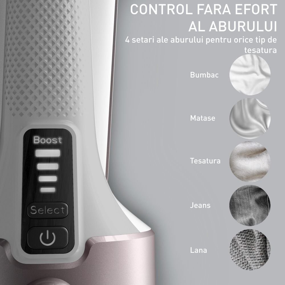 Aparatul ofera un abur variabil de pana la 35 g/min si un jet de abur (boost) de 90 g/min, asigurand o netezire impecabila a tesaturilor. Cele 4 trepte de abur permit adaptarea precisa la orice tip de material, de la matase la bumbac gros, in timp ce modul Eco te ajuta sa economisesti pana la 35% energie. Pe langa netezire, puterea naturala a aburului igienizeaza, eliminand pana la 99.99% dintre bacterii, virusuri si mirosuri neplacute.