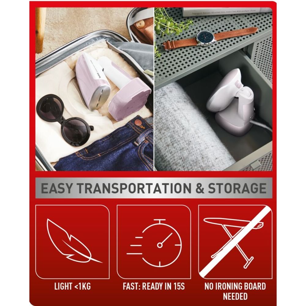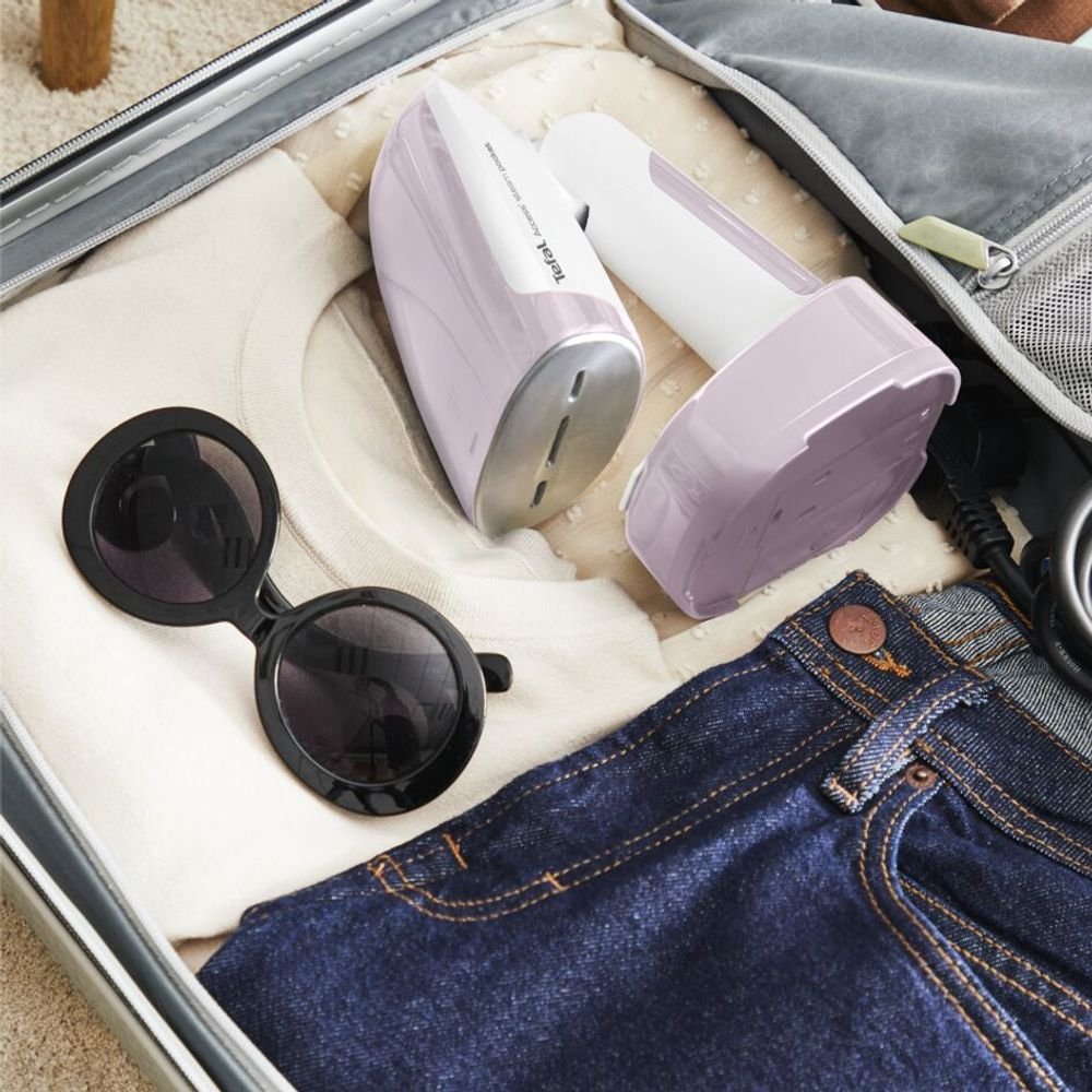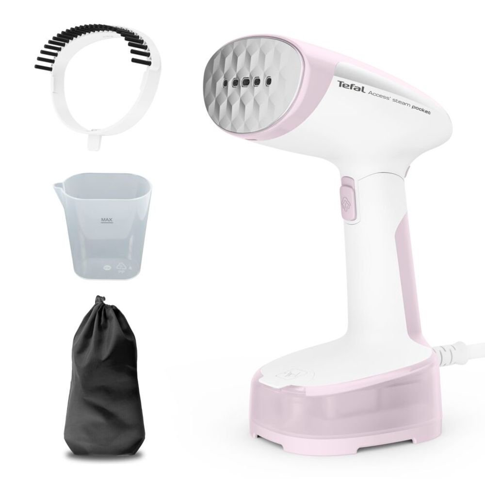 Pachetul contine: perie pentru tesaturi, recipient pentru dozarea apei, husa pentru transport si aparatul de calcat cu abur Tefal Access Steam Pocket;