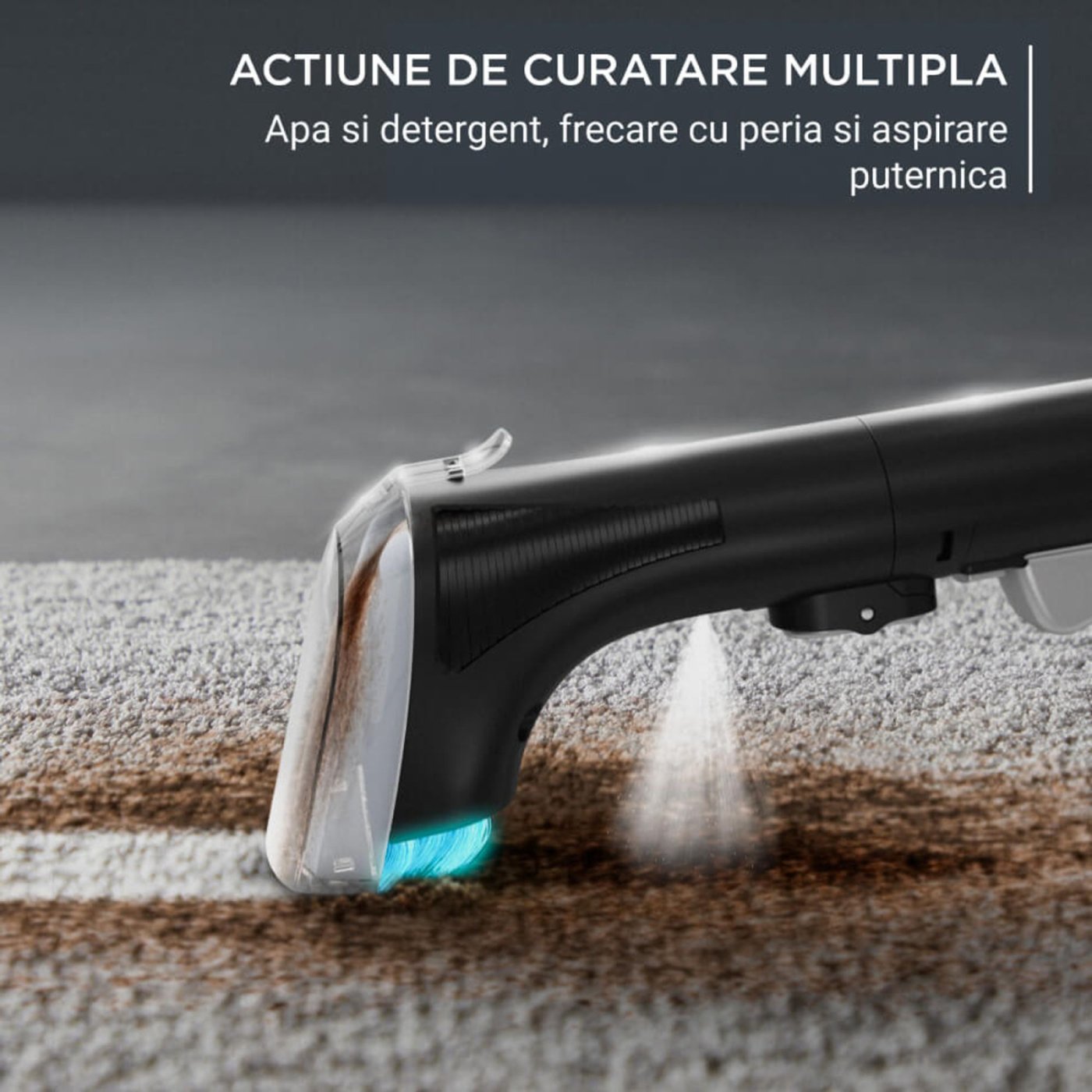 Echipat cu doua rezervoare detasabile (2.3 L apa curata cu detergent si 1.5 L apa murdara), accesorii pentru tapiterie si zone inguste, perii de 8 cm si 15 cm, plus functia de auto-curatare, aspiratorul ofera rezultate de curatare intense pentru canapele, covoare, saltele sau interior auto.