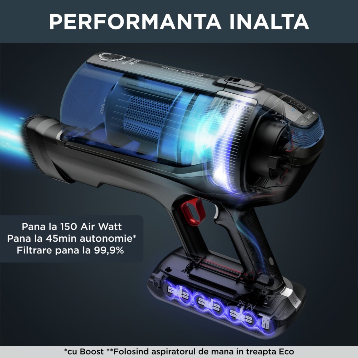 Putere de aspirare de pana la 150 Air Watts (in mod boost);