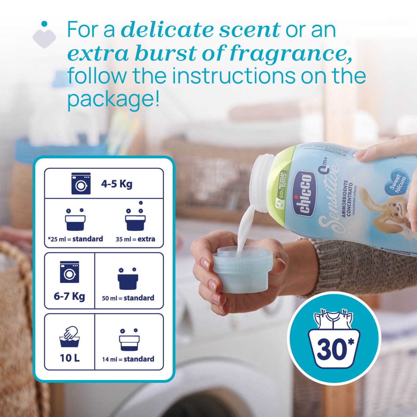 Balsam pentru haine bebelusi Chicco Sweet Talcum, concentrat, 0 luni+. Formula delicata, protejeaza tesaturile si lasa un parfum usor, special pentru copii.