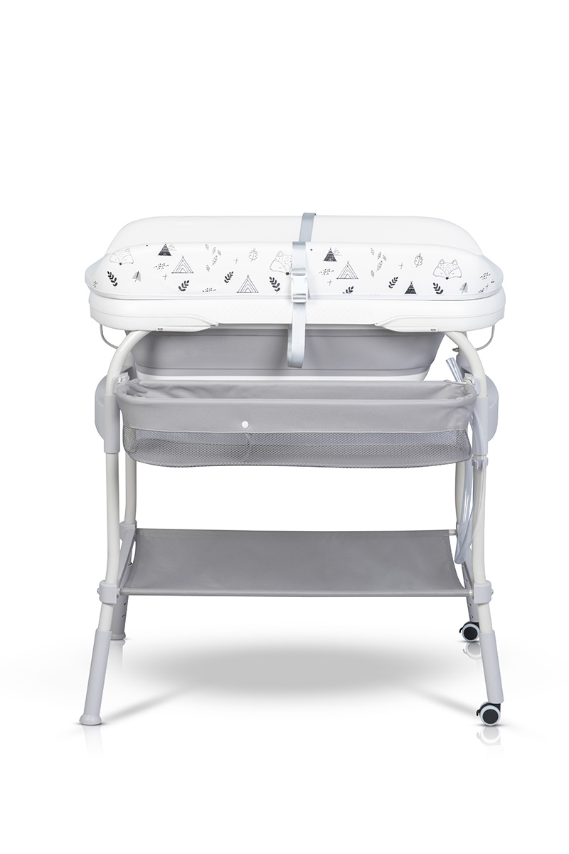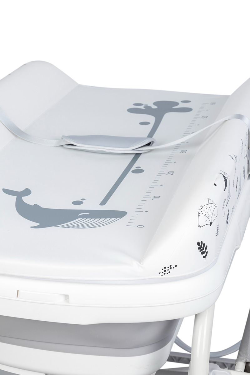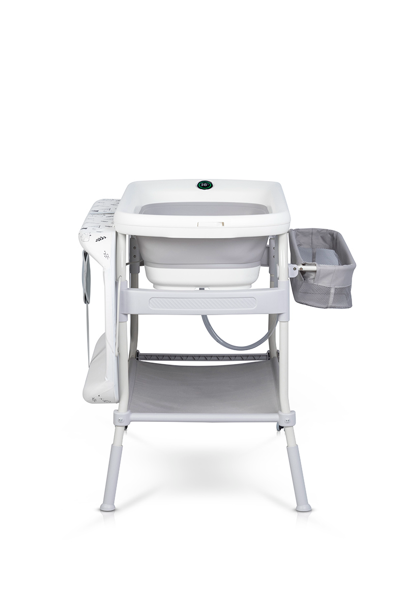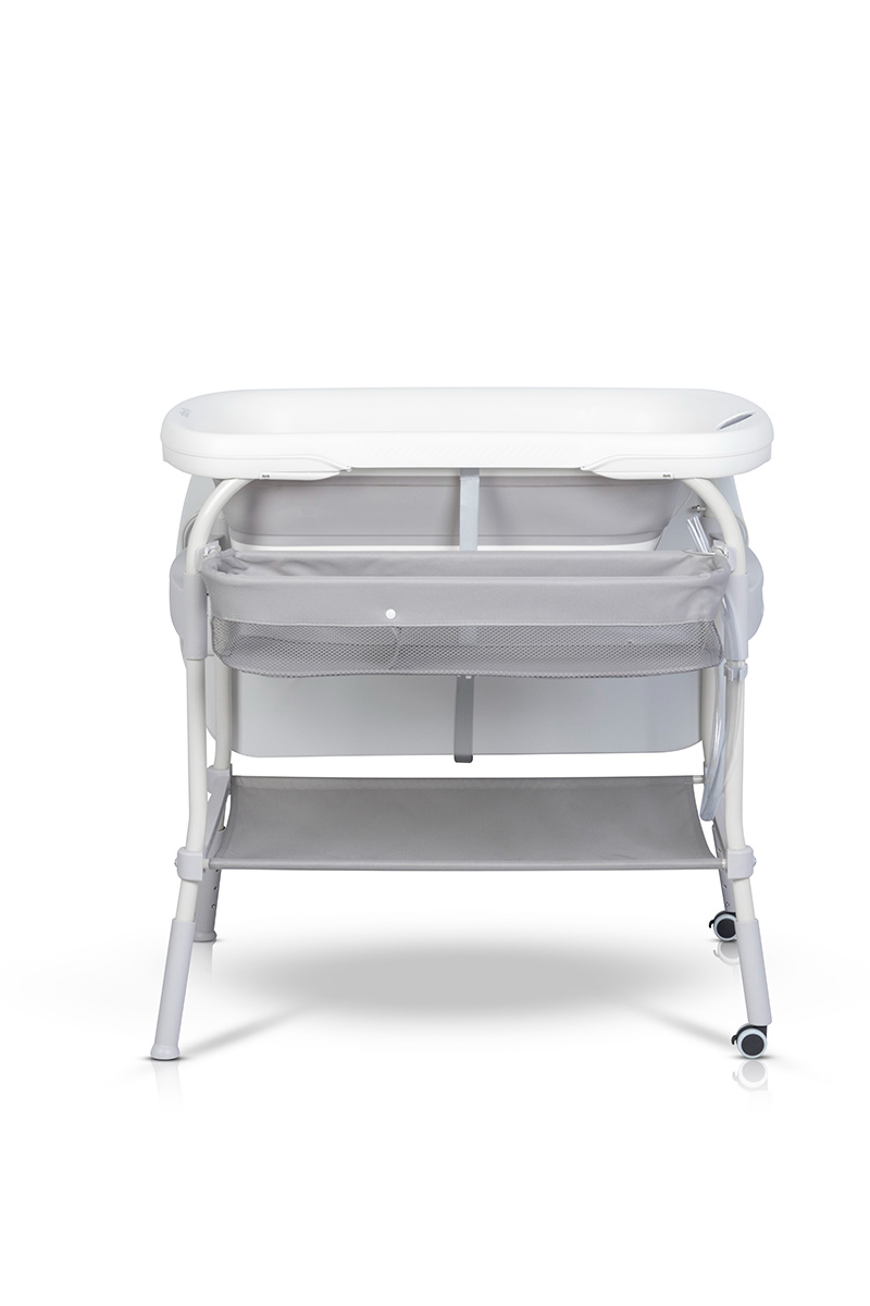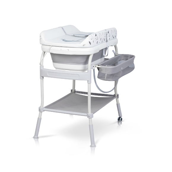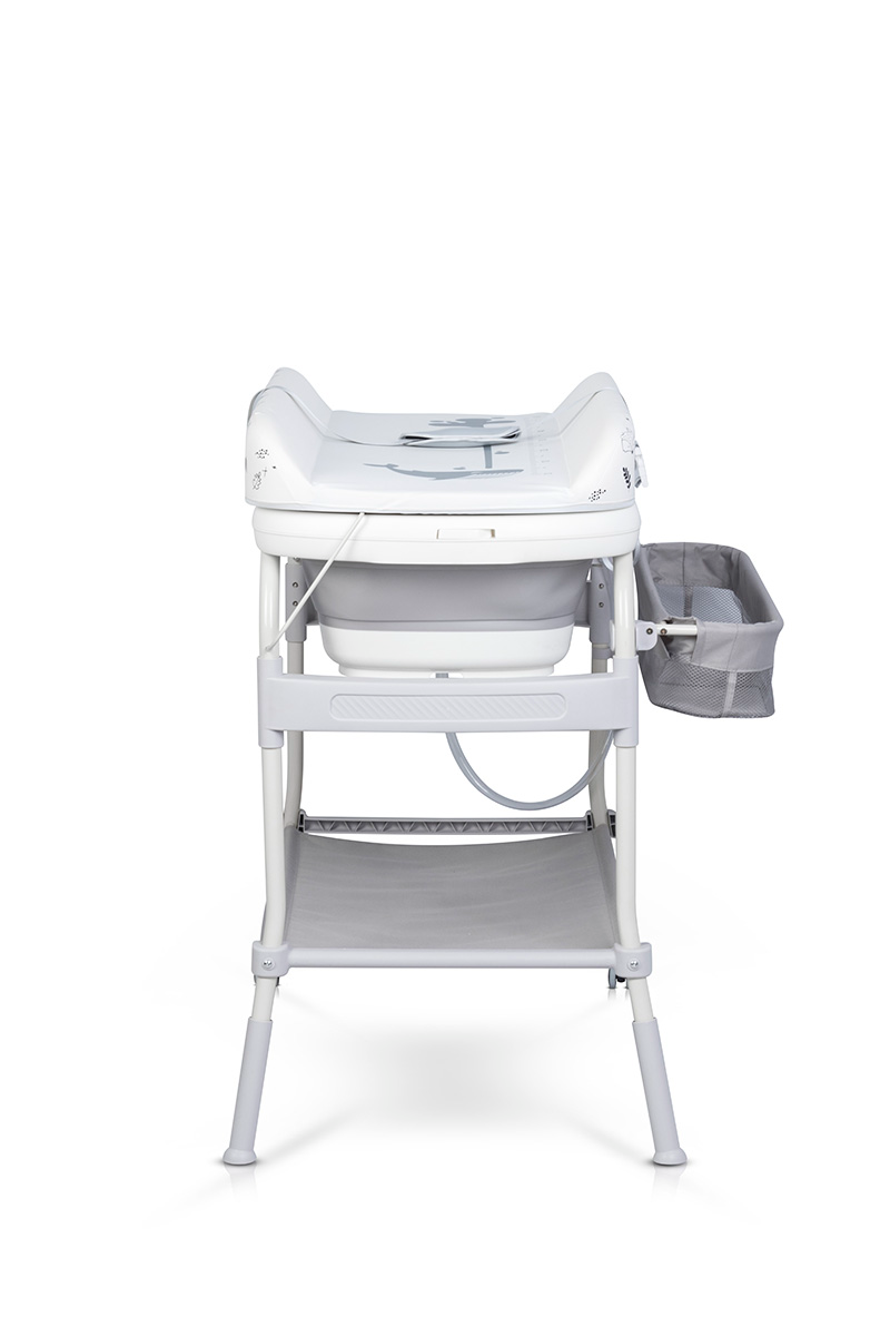 Produsul are 4 trepte de inaltime ajustabile si este dotat cu 2 roti cu frana si 2 sisteme de blocare, pentru a putea fi mutat usor si a ramane stabil in orice situatie. In partea inferioara exista raft mare pentru prosoape si un organizer pliabil pentru accesorii, astfel incat toate obiectele necesare baii si infasatului sa fie la indemana.