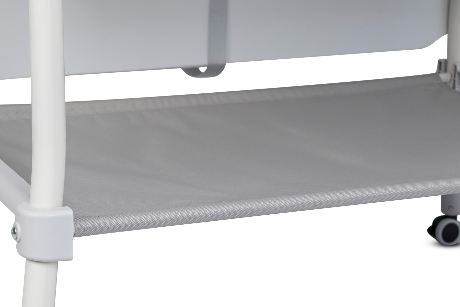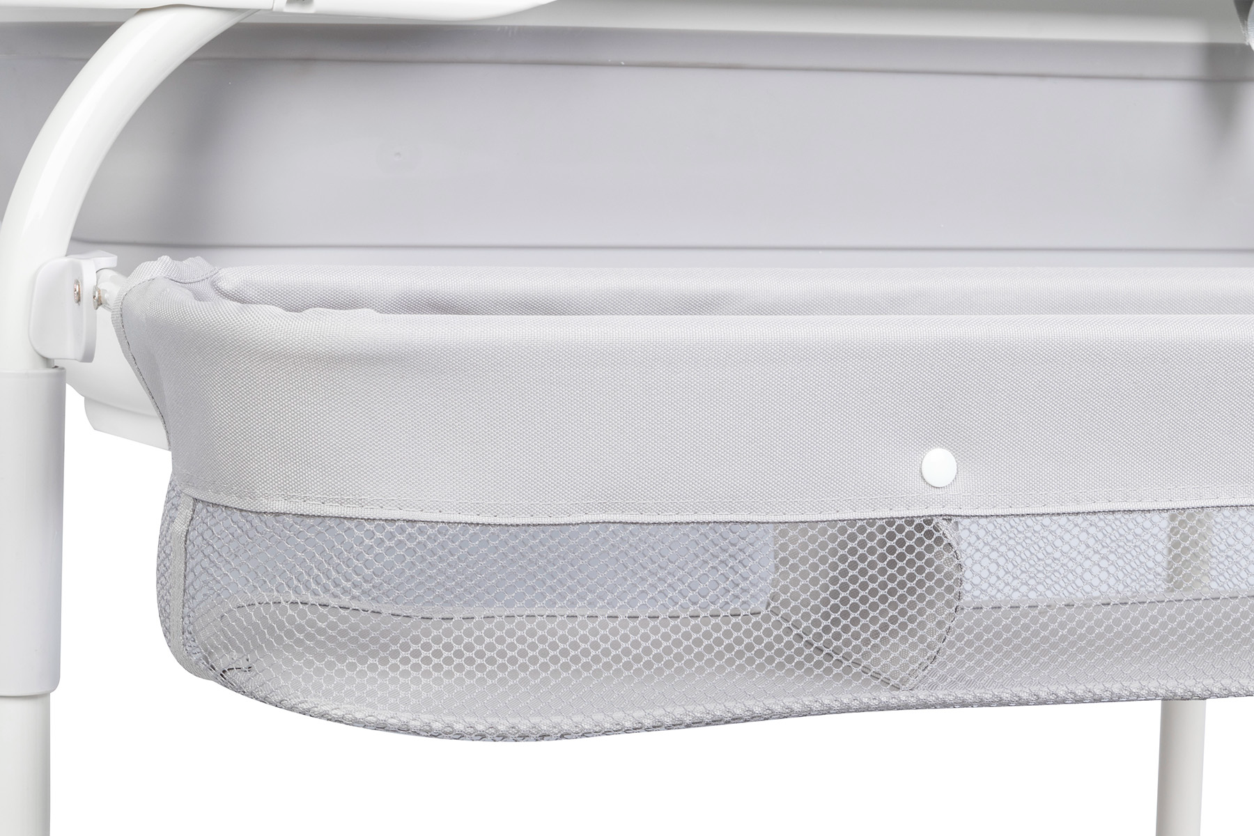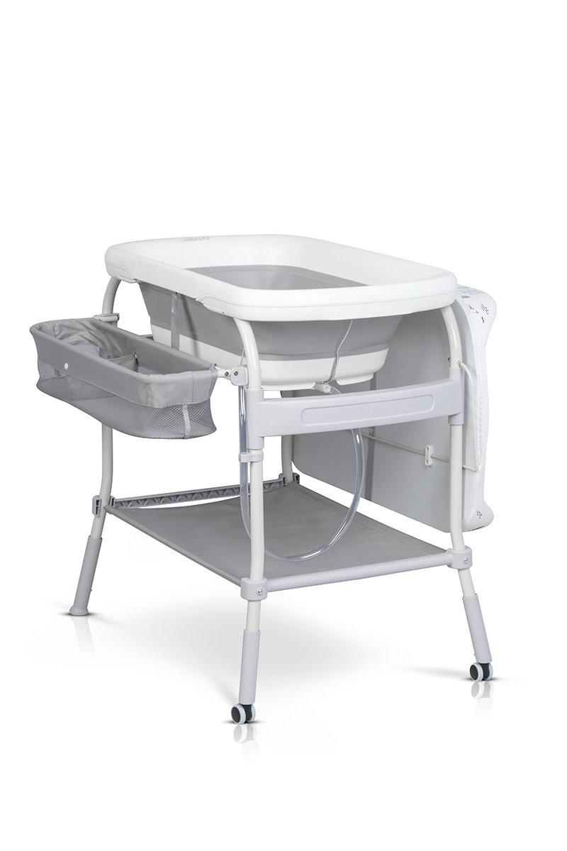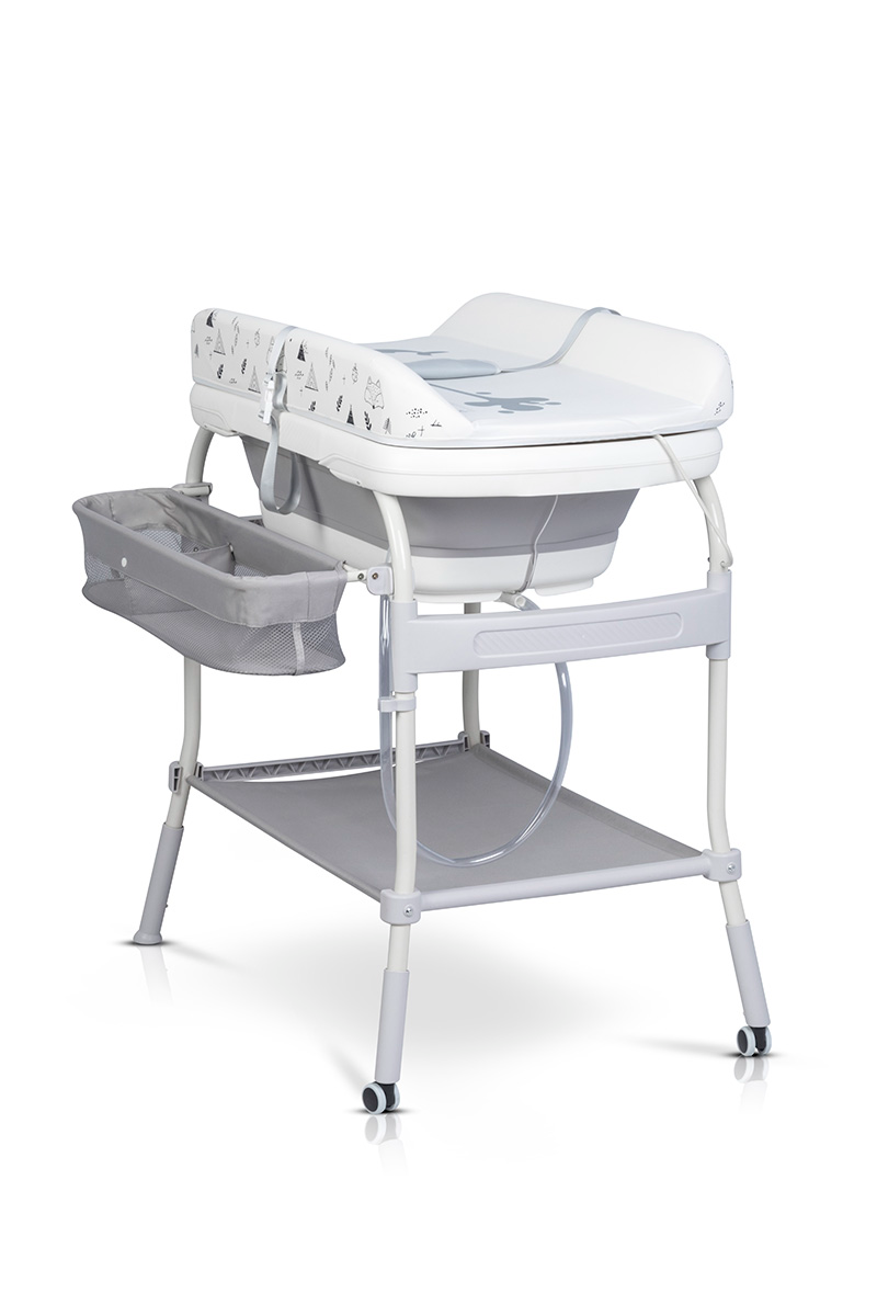 Produsul are 4 trepte de inaltime ajustabile si este dotat cu 2 roti cu frana si 2 sisteme de blocare, pentru a putea fi mutat usor si a ramane stabil in orice situatie. In partea inferioara exista raft mare pentru prosoape si un organizer pliabil pentru accesorii, astfel incat toate obiectele necesare baii si infasatului sa fie la indemana.