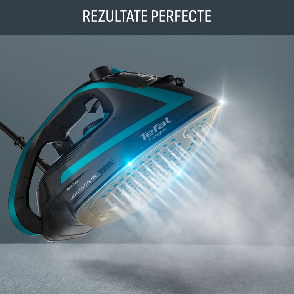 Fier de calcat cu abur Tefal Ultimate Pure FV9844E0, 3200W, Filtru Micro-Calc, Talpa Durilium AirGlide Autoclean, Negru/Bleu