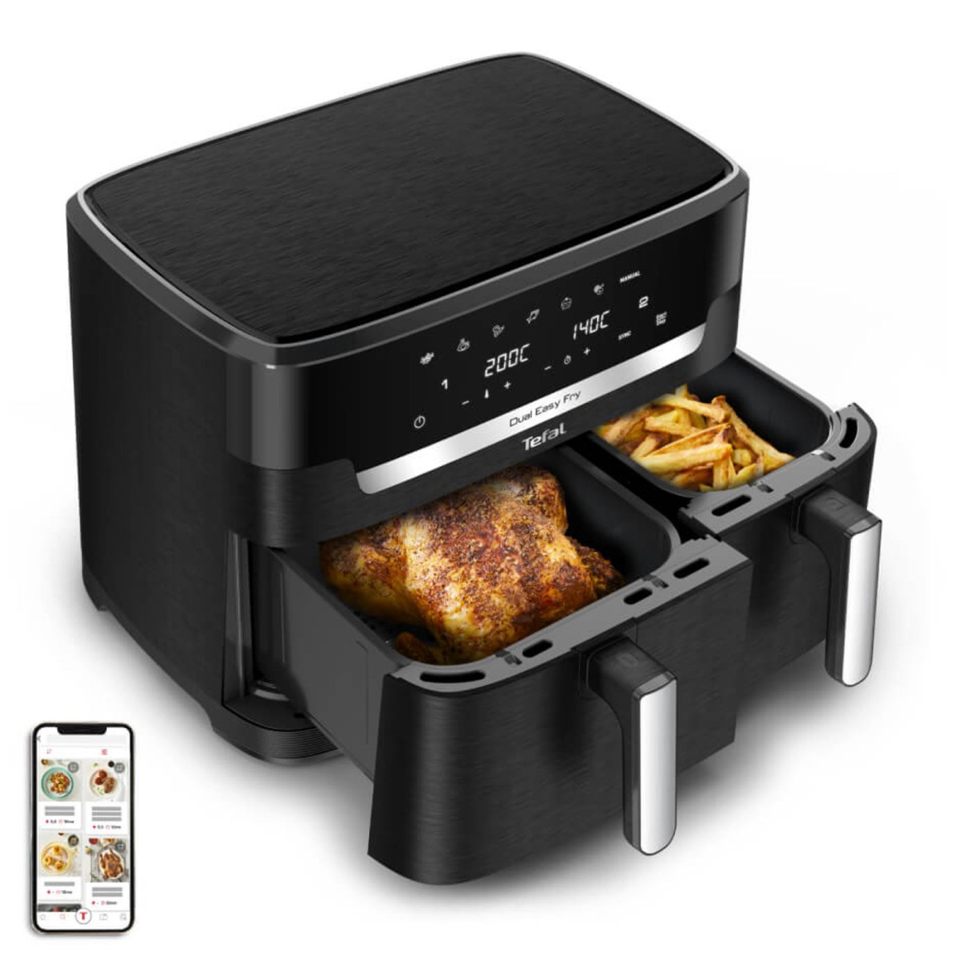 Transforma gatitul zilnic intr-o experienta simpla si eficienta cu Air fryer-ul Tefal XXL Dual Easy Fry, solutia ideala pentru familii numeroase si mese generoase. Datorita designului cu doua compartimente independente, poti prepara simultan felul principal si garnitura, economisind timp fara a face compromisuri la gust.