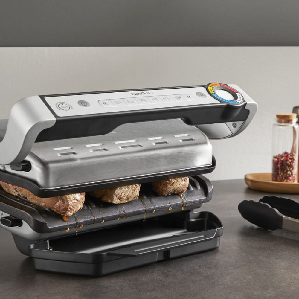 Gratarul electric Tefal OptiGrill+ GC717D10 combina puterea de 2000W cu tehnologia inteligenta de gatire pentru resultate perfecte de fiecare data. Cu 6 programe automate de gatire, acest grill ajusteaza automat timpul si temperatura in functie de grosimea si numarul bucati de carne, pui, peste sau legume, oferindu‑ti preparate suculente fara efort. Indicatorul de gatire te ajuta sa monitorizezi procesul de pregatire — de la rare la bine facut — fara sa fie necesara supravegherea constanta. Plăcile detasabile cu invelis antiaderent faciliteaza curatarea si permit o intretinere usoara, iar tava pentru colectarea sucului asigura un gatit mai curat. Datorita suprafetei generoase de gatit, acest gratar este potrivit pentru preparate pentru pana la 4 persoane. Este perfect pentru gatit sanatos si gustos acasa, fara fum si cu rezultate consistente.