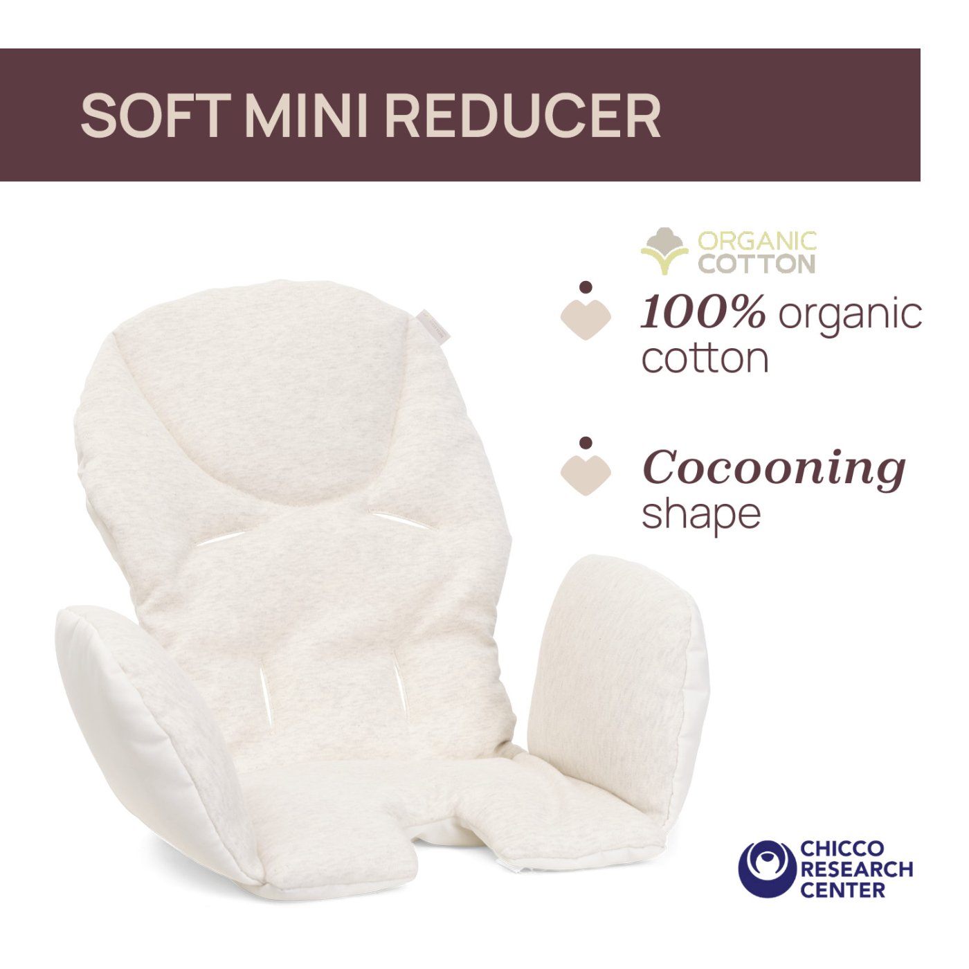 Materiale moi si naturale pentru confort maxim: scaunul de masa include un reductor moale din bumbac 100% organic, oferind copilului o senzatie de cuib primitor si asigurand un maxim de confort;