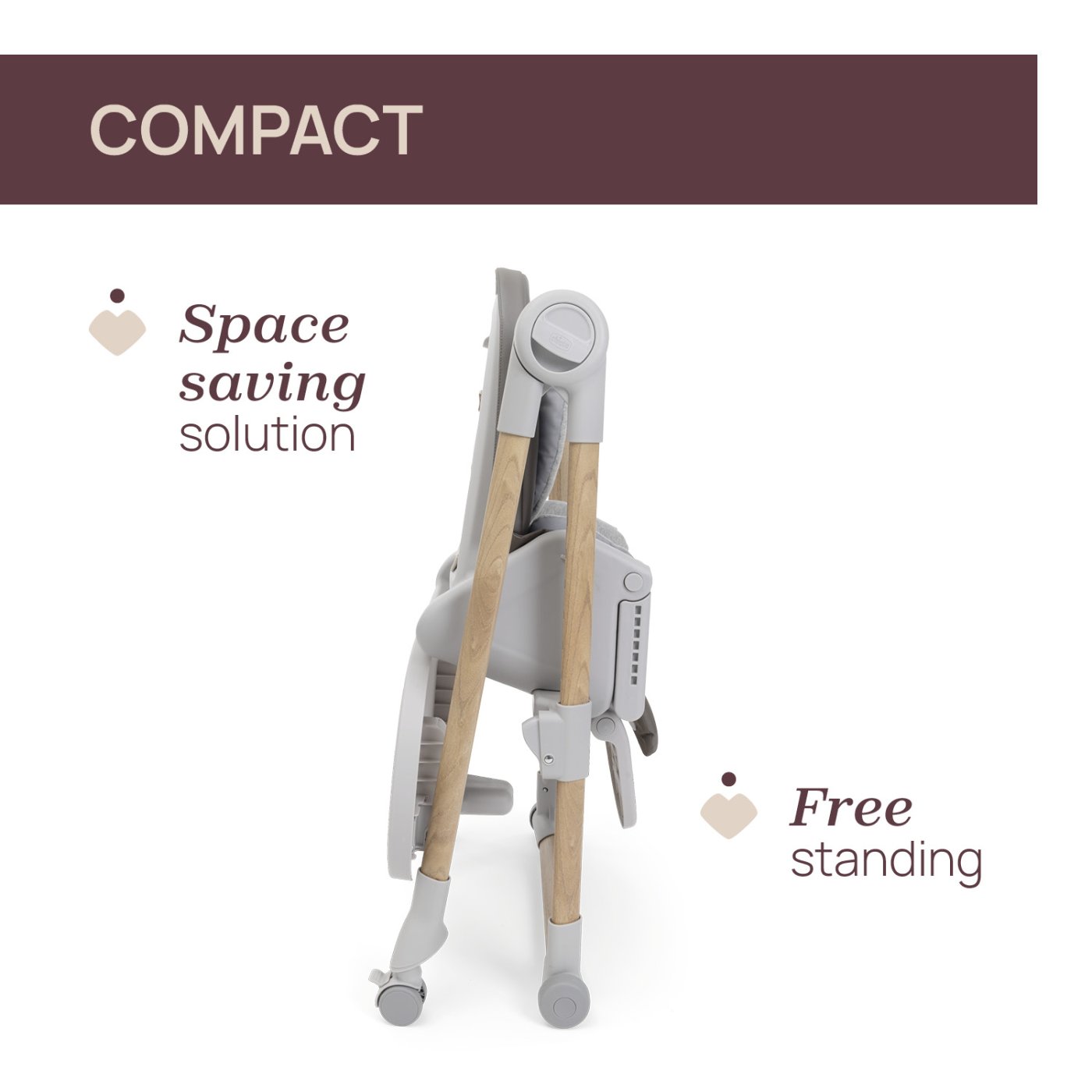 Solutie compacta pentru a economisi spatiu: Polly Armonia este un scaun de masa bebe pliabil ce ramane in pozitie verticala atunci cand este inchis. Tavita poate fi depozitata pe picioarele din spate, pentru acces rapid;