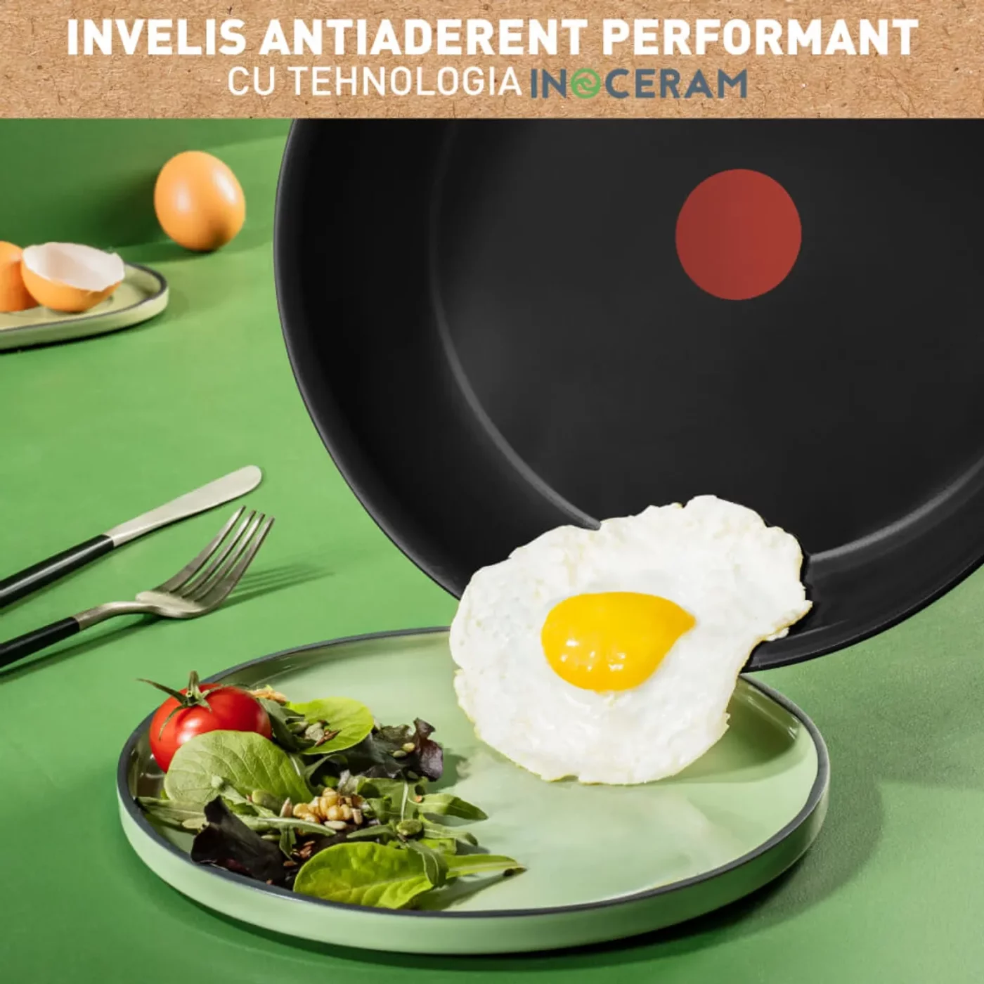Descopera placerea de a gati cu tigaia Tefal Renew Black de 20 cm, proiectata inteligent cu un design eco dintr-un corp de aluminiu 100% reciclat. Beneficiaza de o alunecare fara efort datorita invelisului ceramic antiaderent Inoceram Glide de noua generatie, extrem de durabil si rezistent impotriva exfolierii sau petelor. Tehnologia Thermo-Signal integrata te ghideaza perfect, indicand momentul ideal pentru a incepe gatitul, asigurand mereu preparate pline de savoare. Baza sa cu inductie avansata asigura incalzirea rapida, tigaia fiind compatibila cu absolut toate sursele de caldura (inclusiv inductia). Fabricata in Franta, este solutia ideala pentru gatit sanatos, cu un consum minim de grasimi, fiind sigura pentru mediu si sanatatea ta.