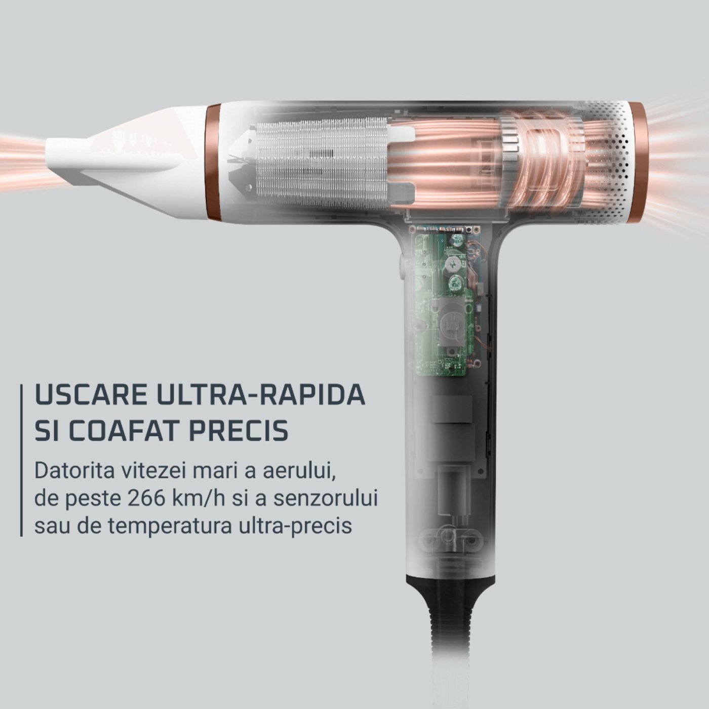 Modelul ofera 3 trepte de viteza si 3 trepte de temperatura, astfel incat sa poti adapta uscarea si temperaturile in functie de tipul tau de par si stilul dorit. Tehnologia cu generator de ioni ajuta la reducerea electricitatii statice si obtinerea unui par mai neted, mai stralucitor si mai usor de aranjat dupa fiecare folosire.